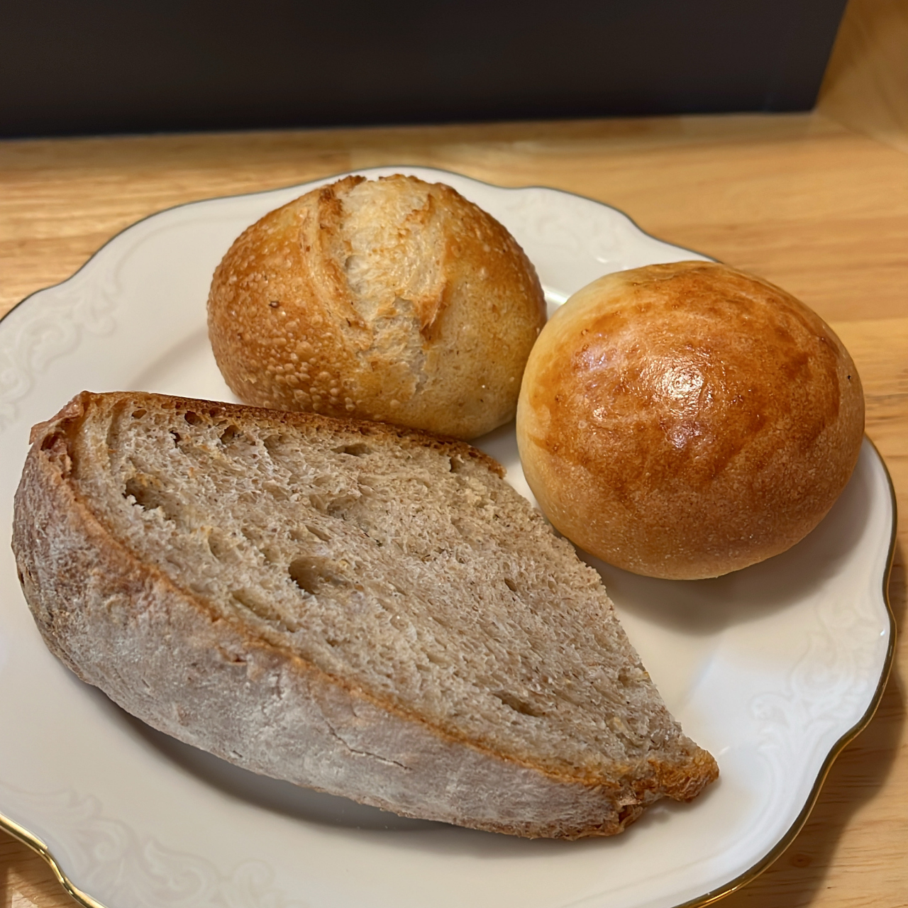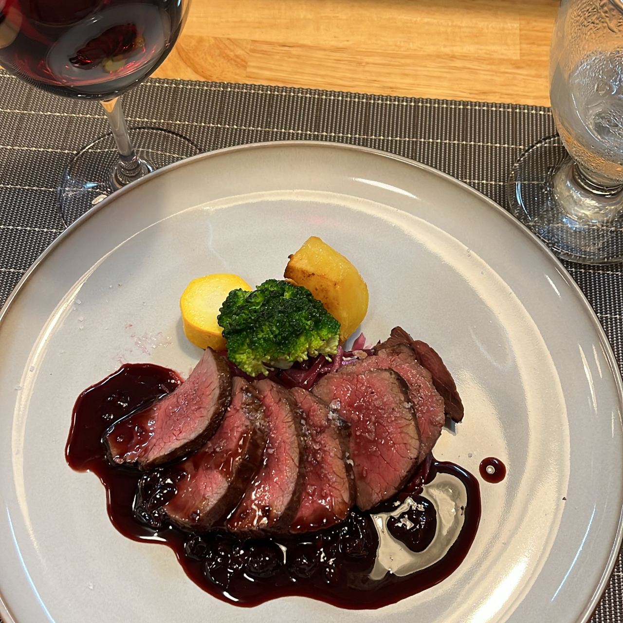 最初に本日のサラダにスパークリングワイン、ついでエゾアワビのソテーにシャルドネ、メインは諏訪産シカのうちももローストにメルロー(お代わり)と進みました。ソースがとても美味しいので、自家製3種のパンを追加して余すところなく味わいます。全ての料理が美味しく、大満足です。