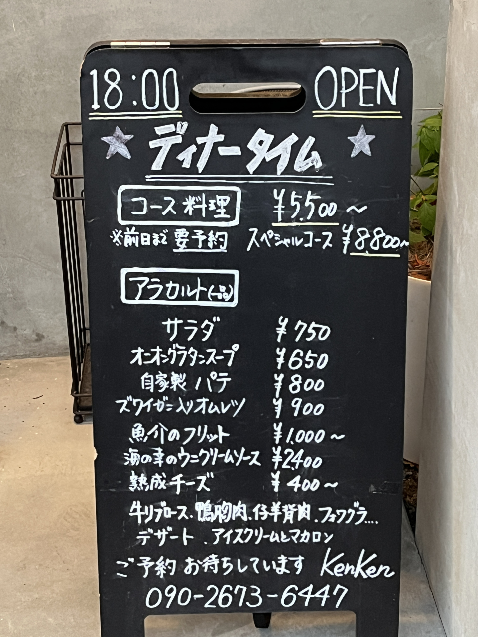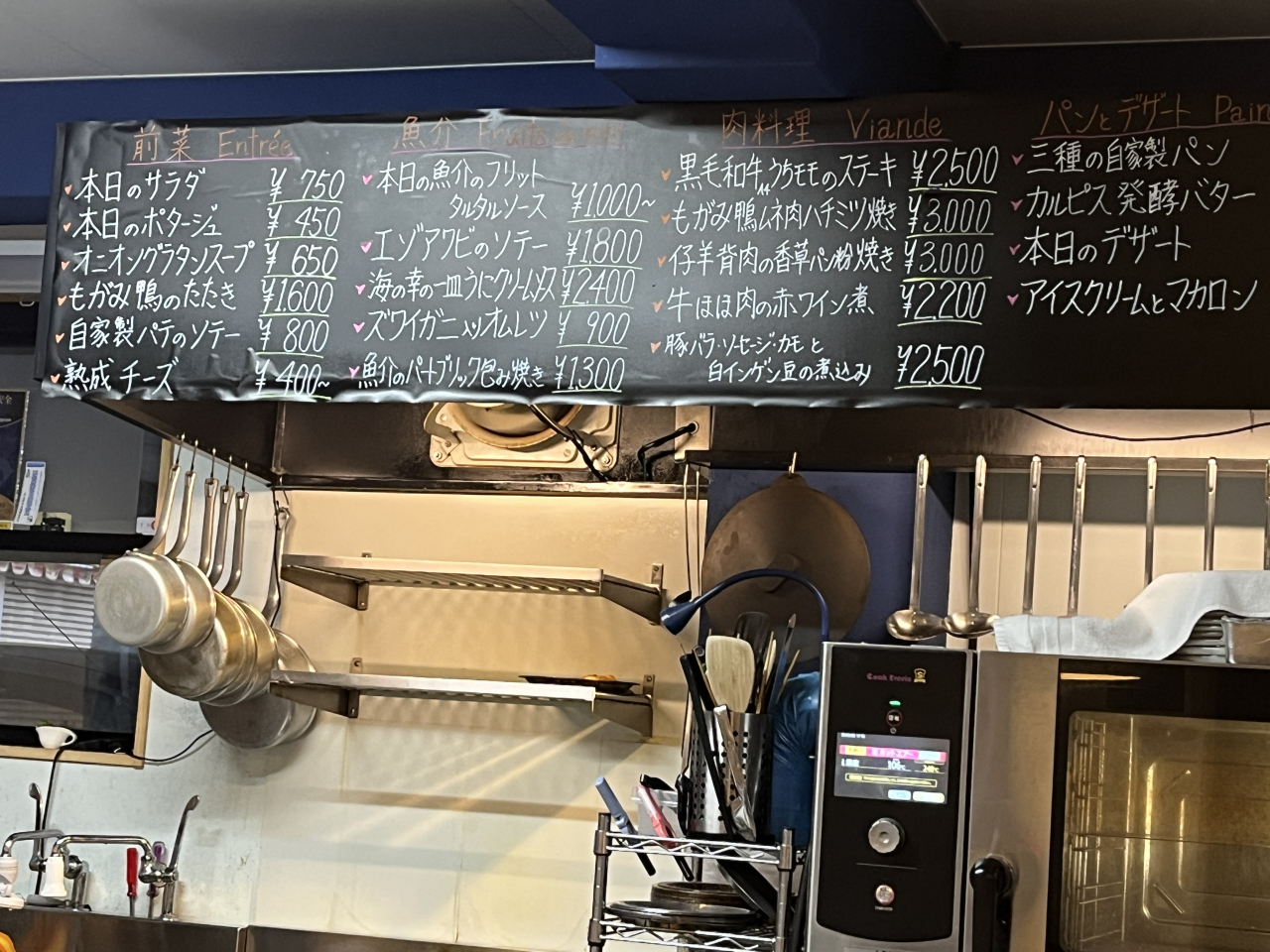 ランチ、ディナーともコース料理がありますが、私の場合、居酒屋目的なのでアラカルトで予約しておきました。小さな店の割にはメニューは多彩で選ぶのに苦労するほど。オーナーシェフの力量が窺われます。