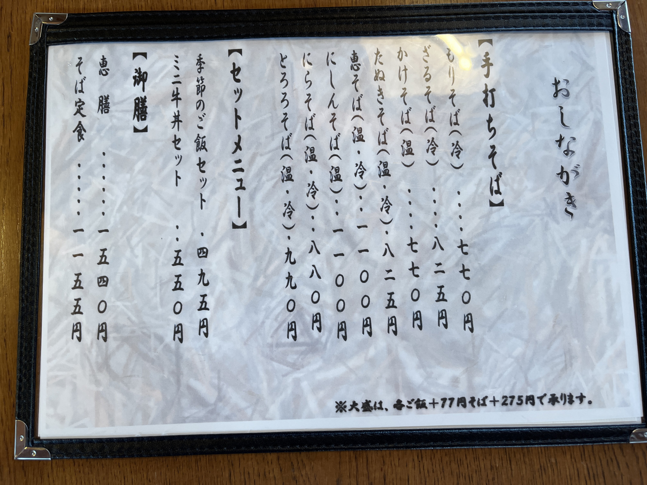 中央高速諏訪南ICから車で2分、八ヶ岳ズームライン入口の御射山交差点の角にあります。2013年9月開業とありますからこの辺りの蕎麦屋としては比較的新しい店です。前を通るたびに徐々に駐車場の車が増えていたので気になって蓼科からの帰路に立ち寄りました。店内24席、駐車場6台+αのこぢんまりとしたお店です。まだ若い夫婦が二人で営業しているようです。