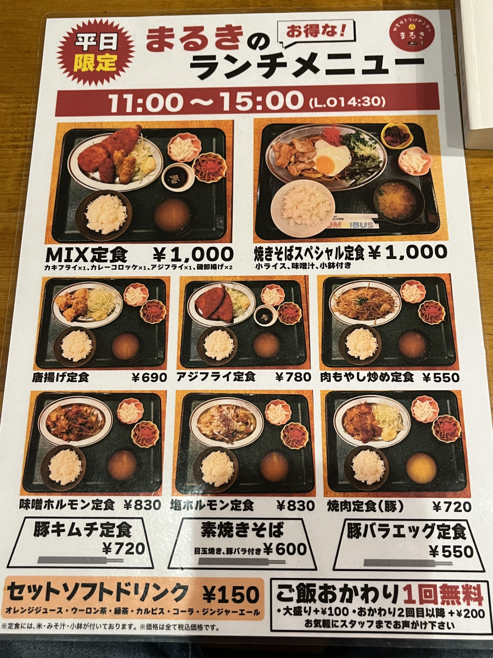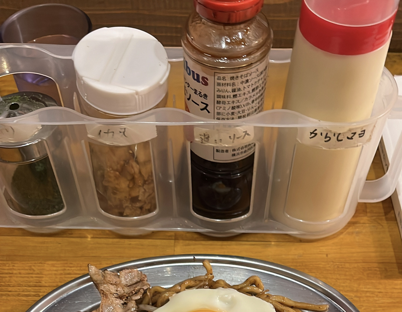 ランチメニューは全て1,000円以下の手頃な価格設定。店名に焼きそばとあるので「素焼きそば」目玉焼き、豚バラ付き 600円を注文。程なくステンレスプレートに載った焼きそばと青のり、イカ天、追いソース、からしマヨの味変セットが到着。もちもち中太麺は懐かしい味で悪くありません。青のりをトッピングするとなおさら美味しい。量は多くありませんが、それほど腹が減っていたわけでもないので、これで満足、コスパ相応です。