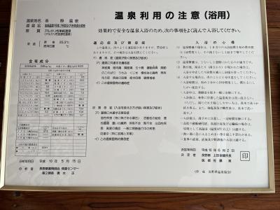 当温泉では、泉質:酸性-含硫黄-ナトリウム-塩化物、硫酸塩温泉(酸性低張性高温泉)、泉温:58.6度と分析結果が表示され、pH3の強酸性、源泉掛け流し(温度調整のため加水)ということです。無味無臭、ほのかに硫黄の匂いが感じられます。