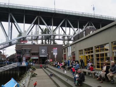 パブリック・マーケットの川沿いにはちょっとしたスペースがあり、フォールス川対岸のダウンタウンのビル群を眺めながらのんびりと時間を過ごすのに最適です。一通り見学を終えたら、そこからアクアバスに乗って、対岸のイェールタウンに行くことをお勧めします。