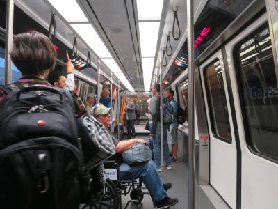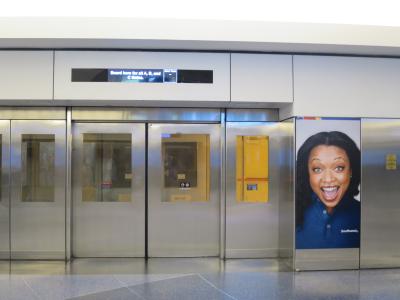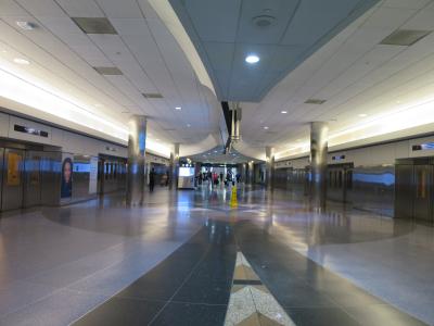 チェックインはフロアに何台もある自動端末でセルフで行うのが基本です。アメリカで最も混雑する空港ですのでセキュリティでは少し並びますが、乗り継ぎは1時間程度を見ておけば問題なさそうです。セキュリティチェックが済めば、そのままエスカレーターで地下のトレイン乗り場に降り、搭乗口のあるターミナルに向かいます。トレインは間断なく出ており、スピードもかなり出ますので移動にはさほど時間がかかりません。