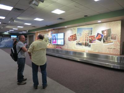 着陸後、エプロンでタラップ(というより長いスロープ)から降り、徒歩でターミナルに向かいます。預け荷物を貨物室から取り出していたので、その場で受け取ろうとしたら、そのままターミナルに入るよう指示されます。バゲッジクレイムのカルーセルもありました。