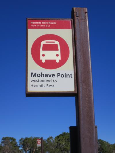 夕刻にウエストリム(ハーミッツレストルート)をシャトルバスで回りました。全部で9つのバス停(=ビューポイント)がありますが、時間がないのでホピポイント、モハーベポイント、ピマポイントの3つに絞り、この順番で回りました。日が傾くにつれ、刻々と変わる渓谷の表情を楽しむことができます。