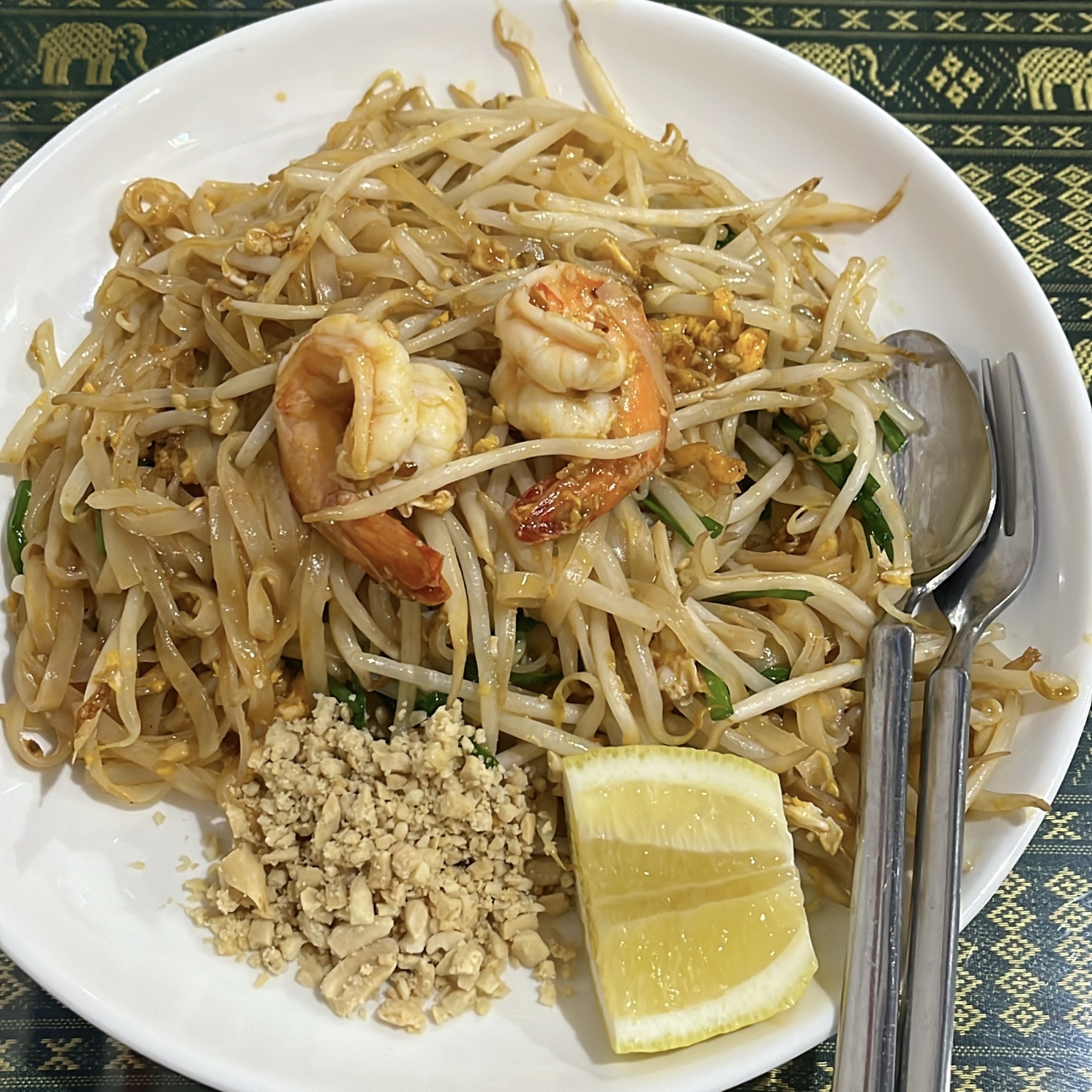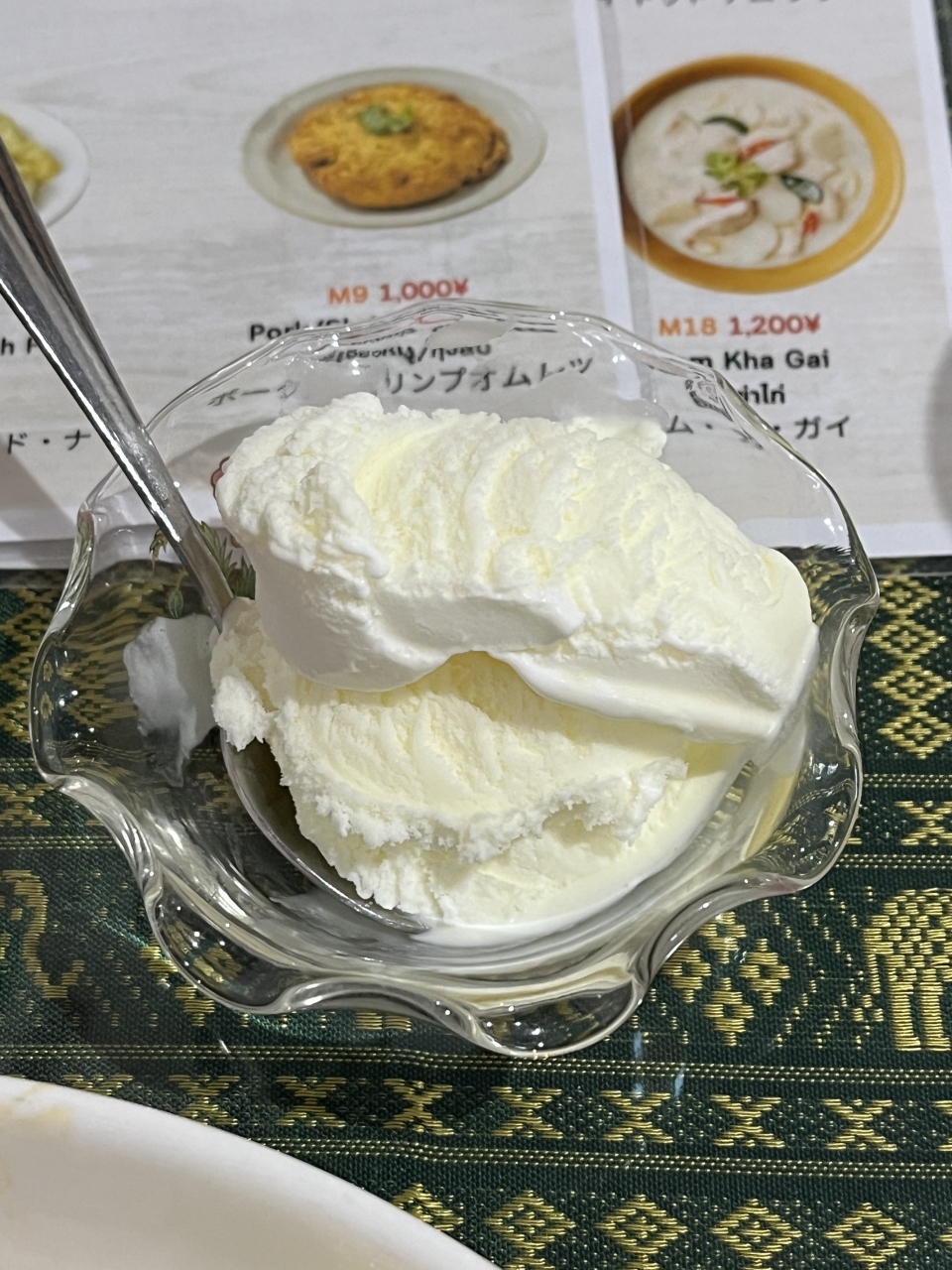 パッタイは日本人向けにややマイルドな味付けですがとても美味しい。好みで酢、唐辛子、ナムプラー、砂糖などの調味料で味付けできますが、そのままでも十分です。量もたっぷりで一人ならこれで満腹、二人以上ならサラダなど追加するのも良いでしょう。野菜スープがついており、食後にサービスなのかバニラアイスクリームが提供されました。会計を終えるとサービスでキャンディーやソフトキャンディー、テーブルには金・土曜の夜間営業向けかおつまみ用の豆菓子も置いてあり、アットホームです。