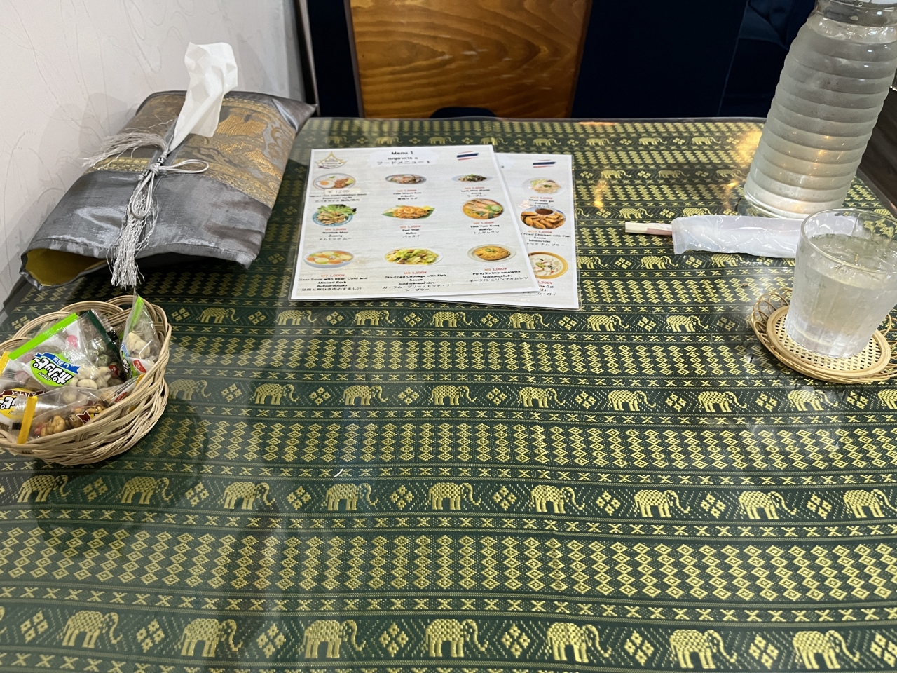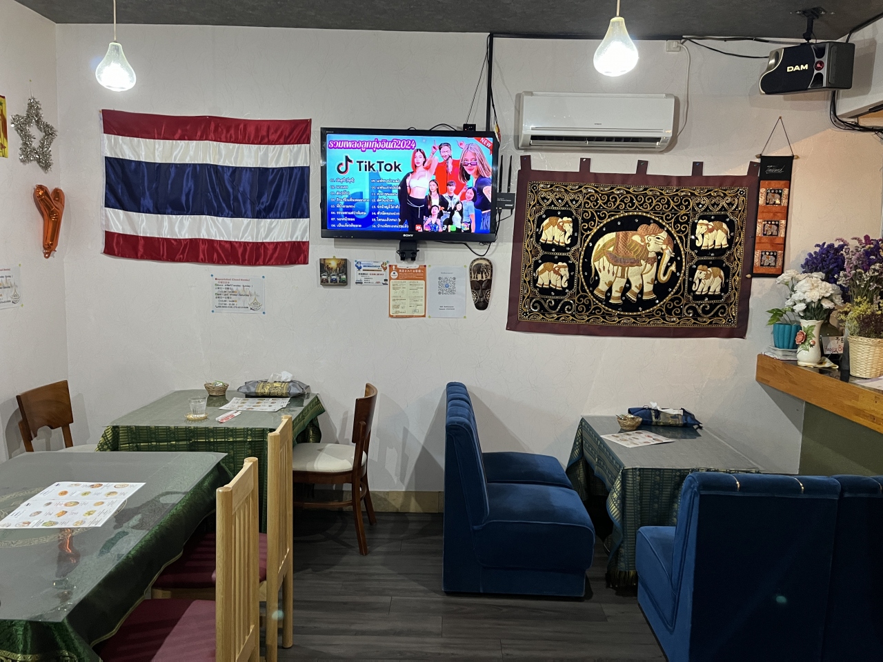 店内はカウンターやスピーカーが残り、いかにもカラオケスナック風ですが清潔。テーブル4台14席、カウンター4席あります。テーブルクロスがタイシルクでインテリアの中では一番高そう。タイ歌謡が静かに流れる店内。各テーブルにティッシュが置いてあるのはいかにも東南アジア風です。