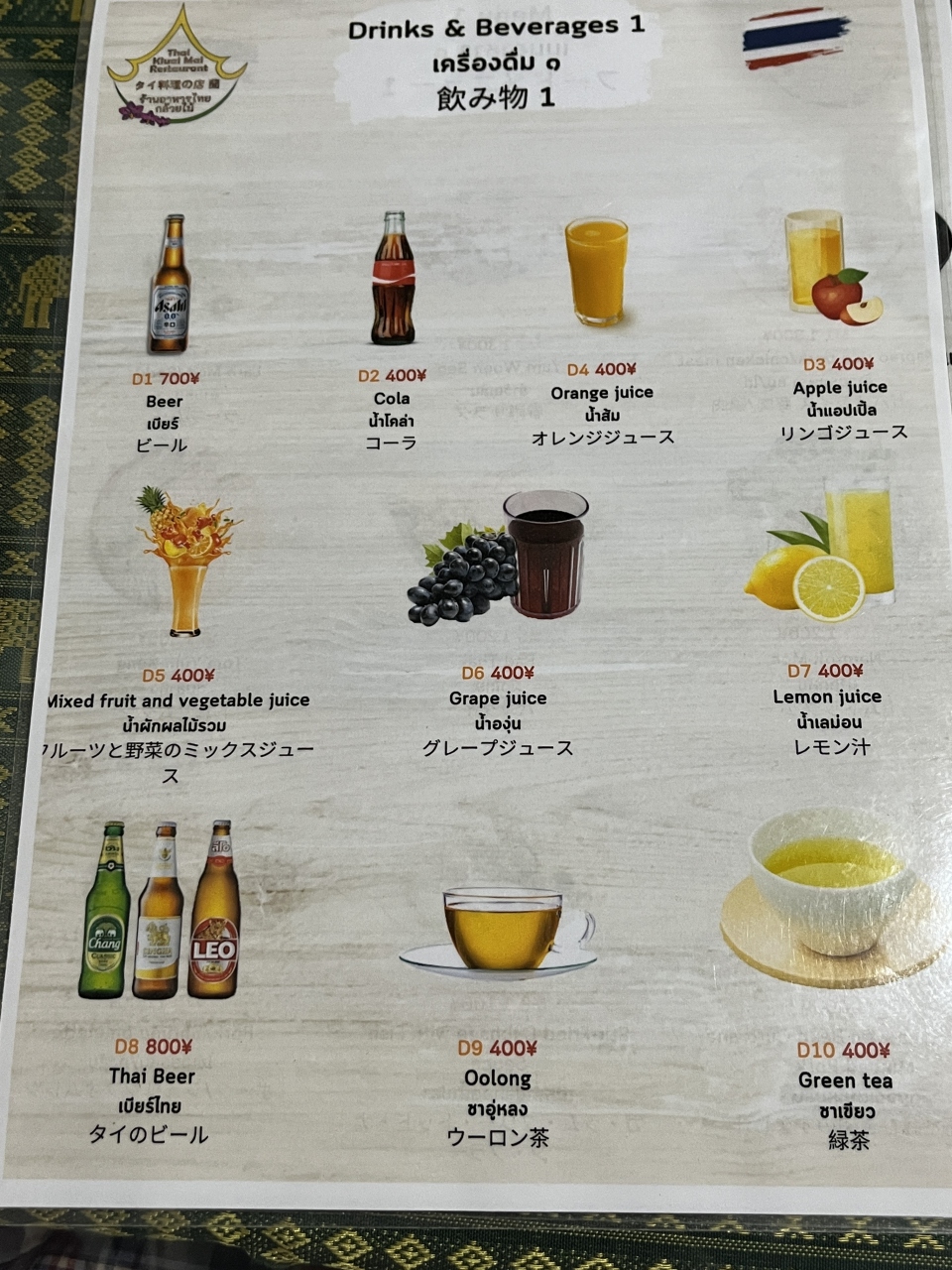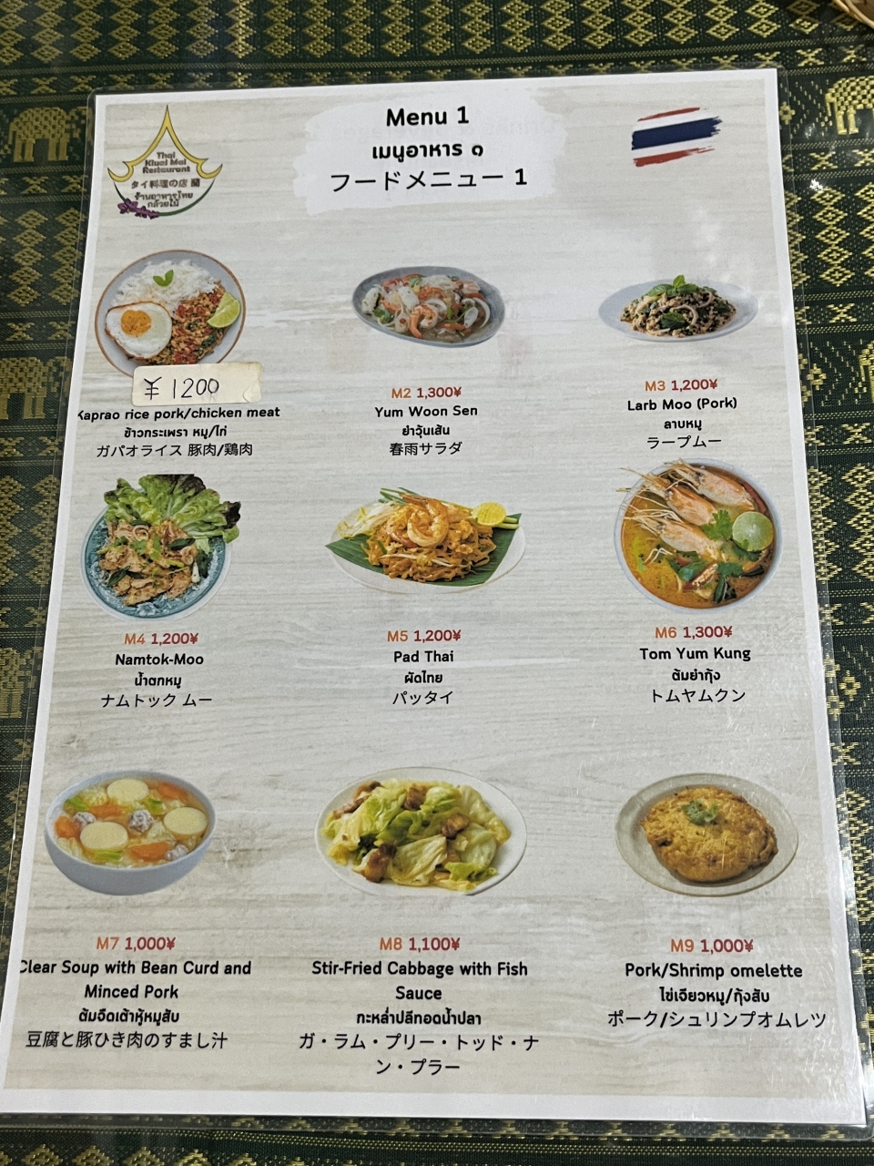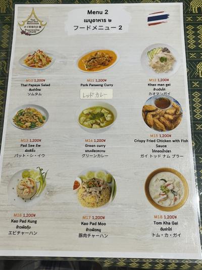 メニューにはたくさんのタイ料理が並び、選ぶのに苦労するほど。一人だし、初めてでもあるのでパッタイ 1,200円を注文。ほとんどの料理が1,200円前後の価格帯、トムヤムクン、グリーンカレー、ヤムウンセン、トムカーガイ、ガパオライスなどがお勧めのようです。