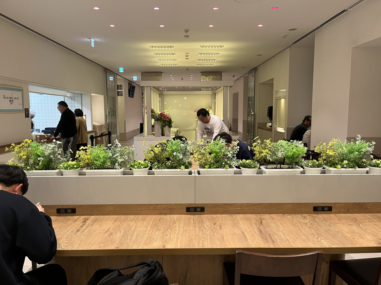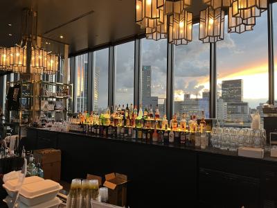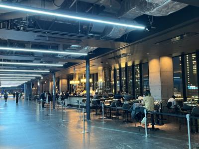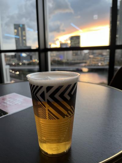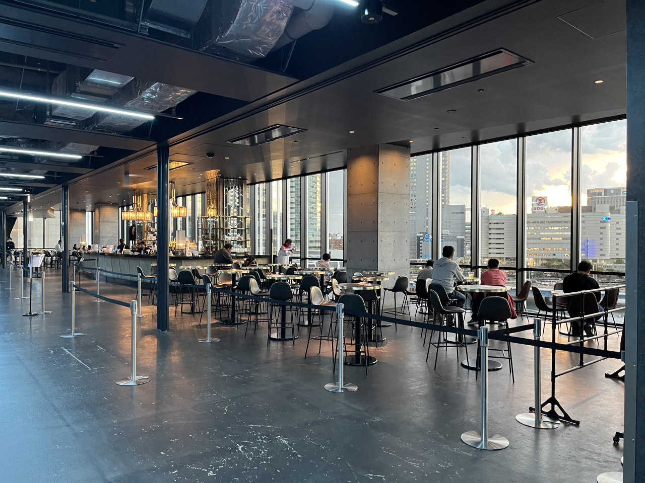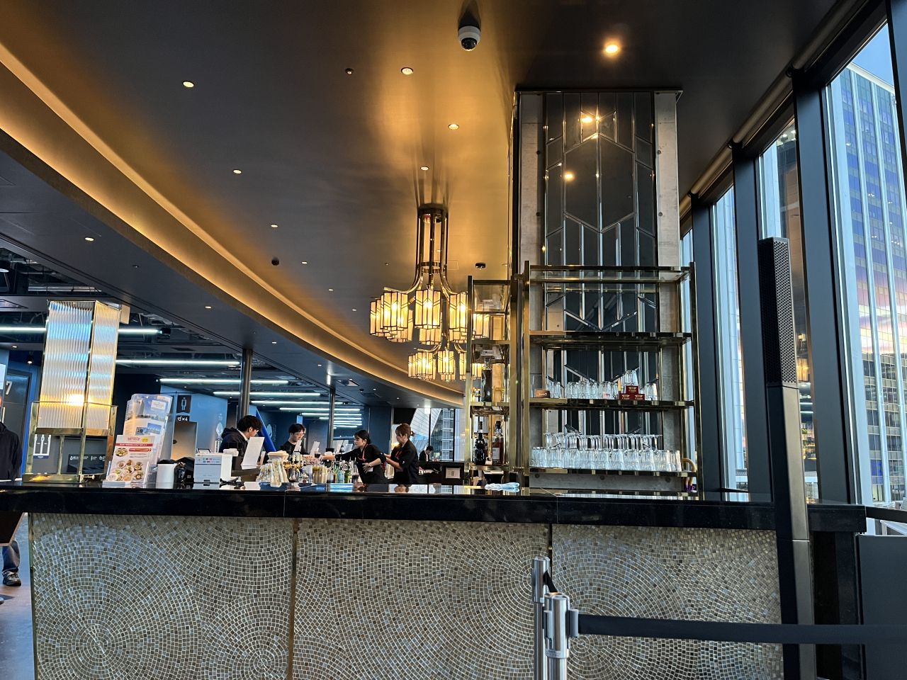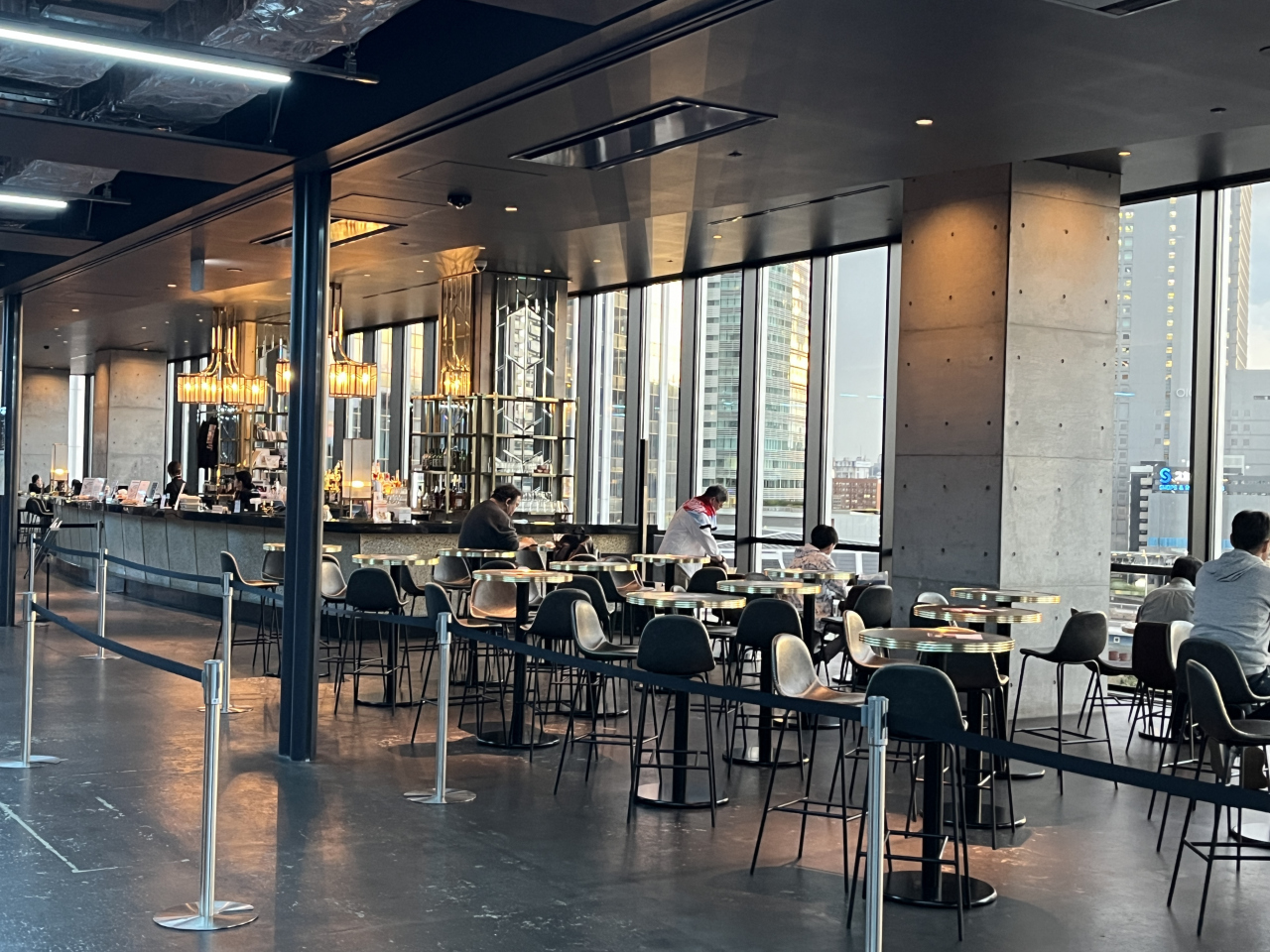 丸テーブルにチェアが4つ、全部で120席くらいあり、ハイテーブル、ローテーブルの2種があります。窓側1列がローテーブルです。軽食とドリンクをカウンターで注文し、自分で席に持っていくスタイル。メニューも多彩です。ライブ会場らしく店内には音楽がガンガン流れています。全席2万席のフルモード・ライブだと混み合うかもしれませんが、レベル7を封鎖したミドルモード(1.3万人収容)での公演日はレベル7まで上る客は少なく、意外な穴場です。窓の外に広がるみなとみらいの夕景を楽しみながら、開演までゆったり過ごすことができます。飲食物の値段も普通です。