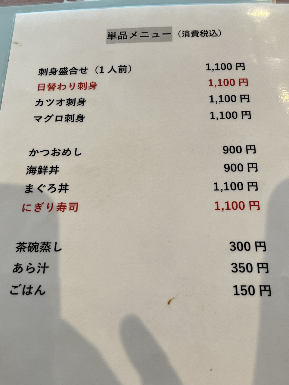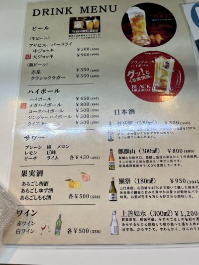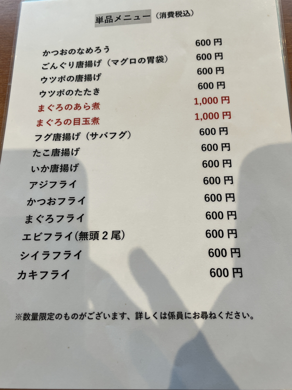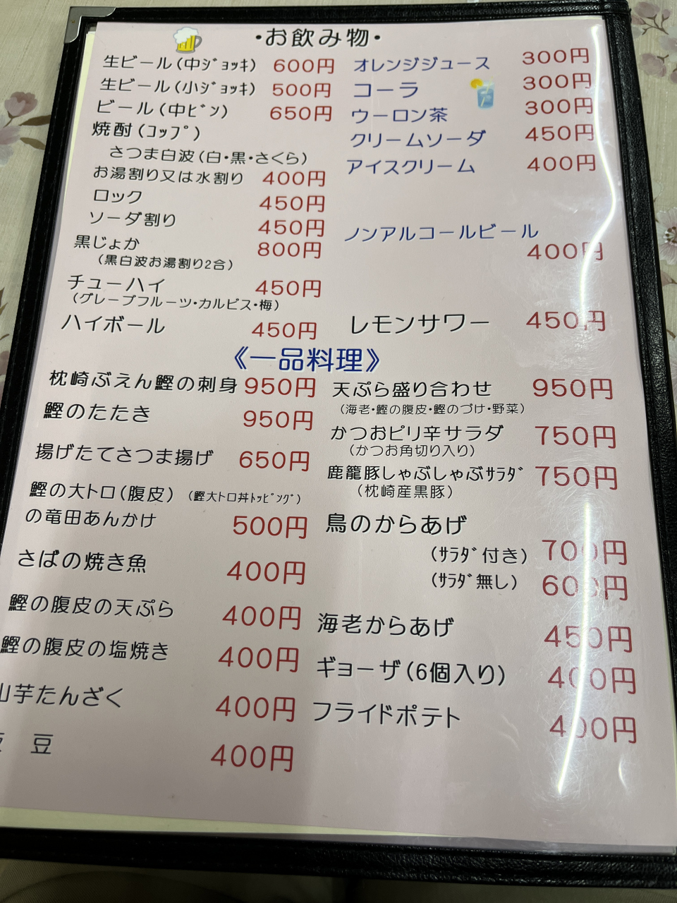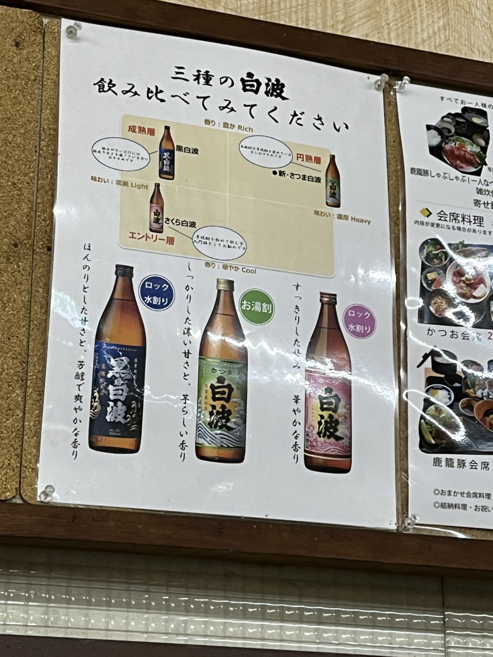 とりあえず生中。その後、店内掲示でおすすめの三種の白波飲み比べに挑戦。さつま白波の本社は枕崎にあります。いささか飲みすぎましたが〆て4,400円、リーズナブルです。