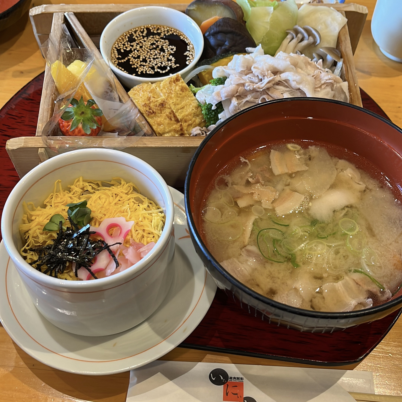 待っている間、地元客にお勧めメニューを尋ねたら黒豚の野菜蒸しセットを一押しされました。もちろんそれに決定。せいろ(黒豚・季節の野菜・季節のフルーツ)と豚汁、蒸し寿司のセットです。某グルメサイトで、すき焼き・しゃぶしゃぶの百名店に選ばれていますが、ランチだと時間がかかりすぎます。その問題を解決したのがこのメニュー。豚汁は作り置きができるし、せいろと蒸し寿司は蒸すだけ。事実、着席して6〜7分で料理が目の前に運ばれてきます。独創的な着想で生まれたこのメニューは驚愕の美味さ。黒豚はもちろん豚汁、蒸し寿司も絶品、さすが専門店です。