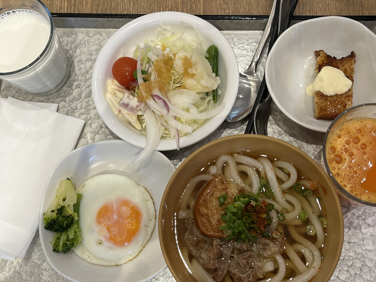 部屋はいつものドーミーインと変わりません。アメニティは過不足なく、大浴場も快適。もちろん湯上がりアイスやヤクルト、夜鳴きそばもいただきます。朝食のご当地グルメは飫肥天うどん、冷や汁、チキン南蛮など。これも美味しくいただきました。