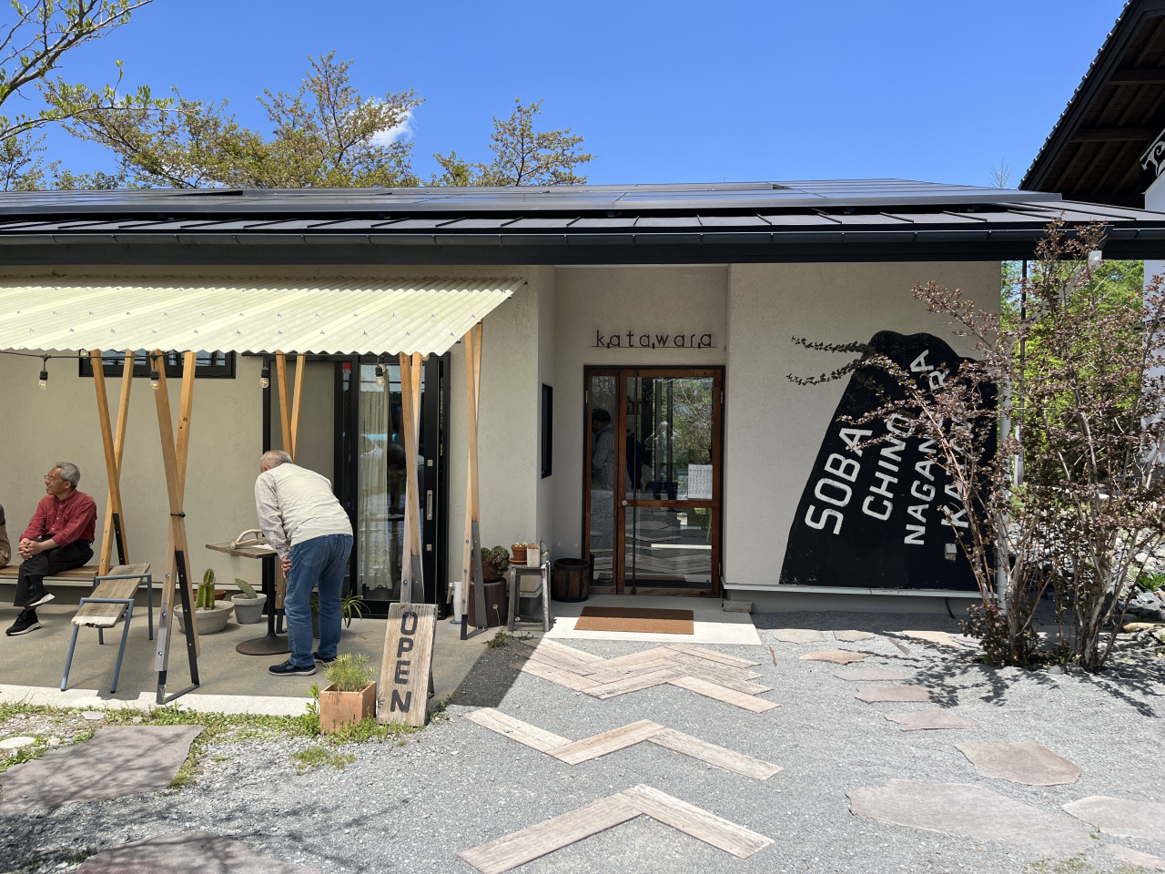 蓼科への往路、ゴールデンウィーク明けの平日昼に立ち寄りました。エコーライン沿いの海鼠壁の蔵と大きな石灯籠が目印です。ネットで評判のそば屋で、正午過ぎ、駐車場はほぼ満車。20台近くの車は全て県外ナンバーです。幸い3組待ち、急ぐ旅でもないのでリストに名前を書いて待つことにしました。ペット同伴かどうかも要申告。25分ほどのウェイティングで入店しました。