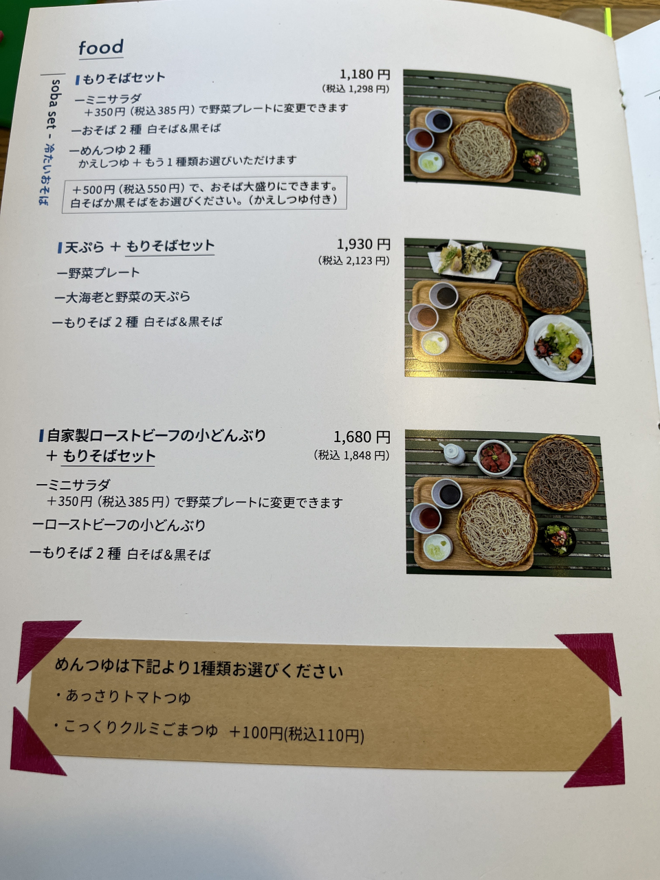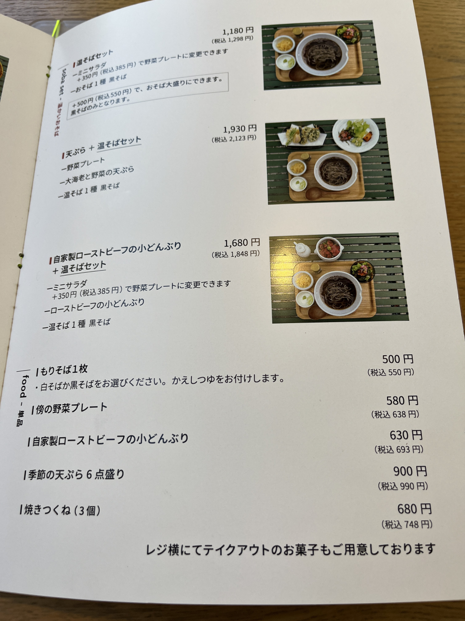 出てきた蕎麦はネギと天かすだけのシンプルな品だけど評判通り美味しい。とりわけつゆが出色の出来です。ただ、時期的にタラの芽やコシアブラなど山菜天ぷらが食べたいところですが、まわりを見渡しても海老などごく当たり前の天ぷらなのであえて注文しませんでした。その代わり自家製ローストビーフ小どんぶりやビーツとじゃがいものポタージュなどお洒落なメニューが並びます。