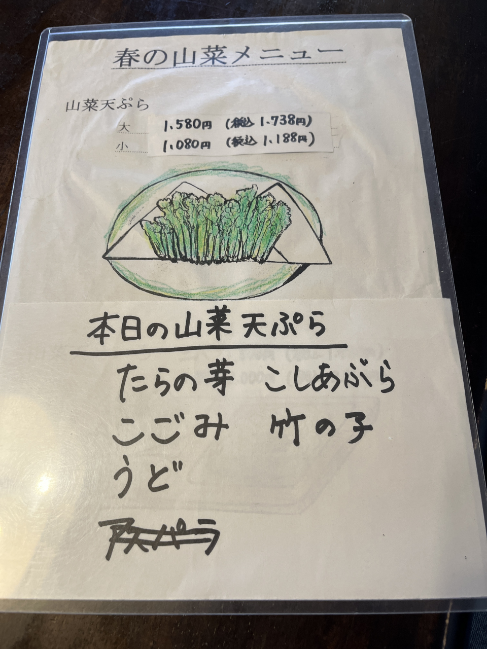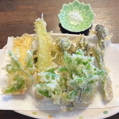 山菜天ぷらは、こごみ、こしあぶら、たらの芽、竹の子、うどのラインアップは申し分ありませんが、カラッと揚がり過ぎてやや山菜の風味に欠けるかなという印象です。それでも十分に美味しい。