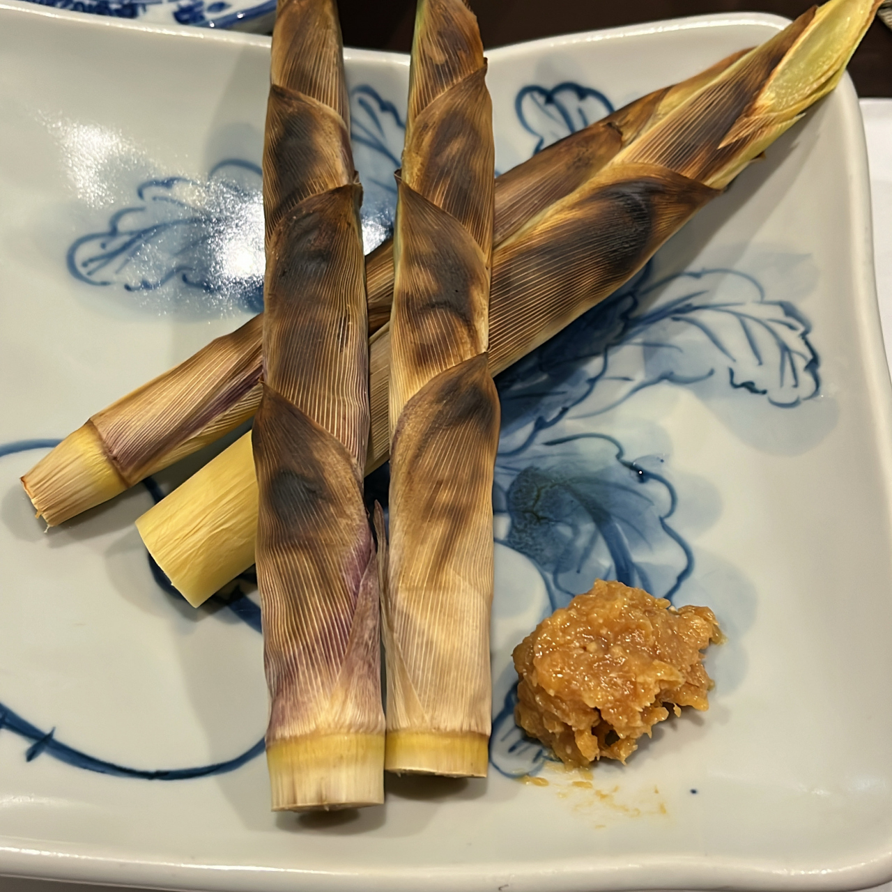 今回は、定番の地場産 極上馬刺し、好物の稚鮎天ぷら、筍まんじゅうの他に、隣席の地元常連客に勧められるままに雪笹、あけびの芽、焼 根曲り竹など山菜のオンパレード。どれも文句なく美味しい。絶品です。