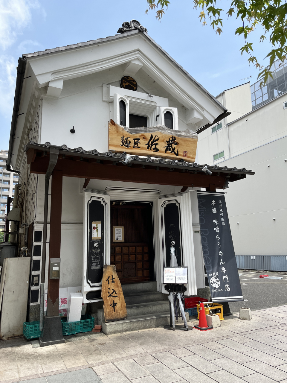松本城の東南、中町通りから国道143号を少し北上して西に入った路地にあります。蔵を模した和風ファサードに大きな三階菱、店の佇まいからも期待が持てます。