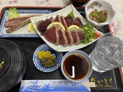 枕崎なら有名なぶえん鰹と思い、刺身とカツオたたき定食を注文。定食には希少部位の腹皮の塩焼きもついておりまさにカツオのオンパレード。それぞれの味も申し分ありません。かつおラーメンが人気のようで、先ほどの女性二人はそれを注文していました。