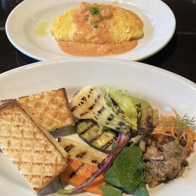 朝食のトーストサンドと肉や野菜のサラダ、ふんわりオムレツも絶品です。