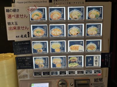 平日の開店前から並び4番目に入店しました。面白いのは、名前を書くウェイティングリストがなく、店の前の歩道の向かい側に客が並び、開店しても客が一斉に入店するのではなく、1組招き入れられると扉が閉まります。前の客が券売機で食券を買って席に導かれると、次の客がまた1組入店し、食券を買うという仕組みです。