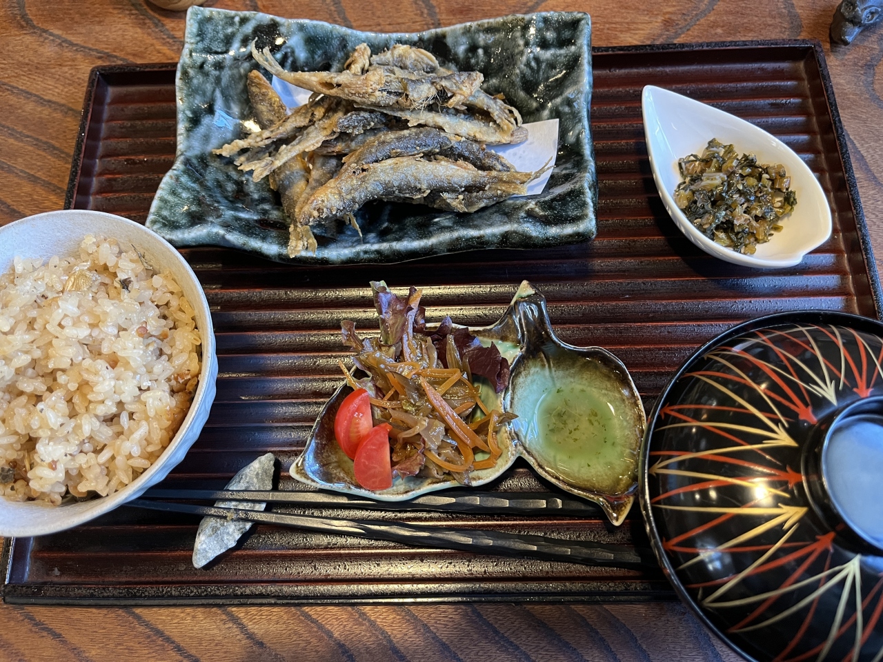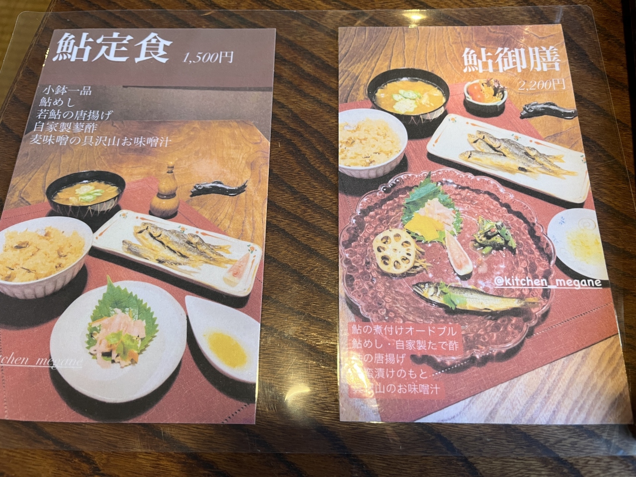 ランチメニューは、鮎定食 1,500円と鮎御膳 2,200円が中心。鮎御膳は鮎の煮付けオードブル、若鮎の唐揚げ、鮎めしに味噌汁と南蛮漬けのもとがセットになっています。前日18時までに予約すれば木サラダがサービスで付きます。他に一品料理もあります。