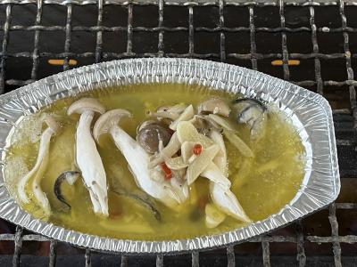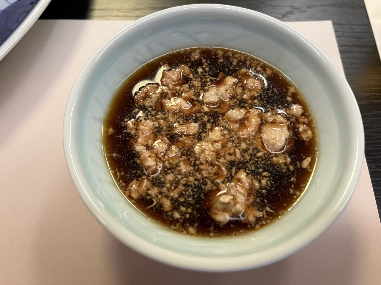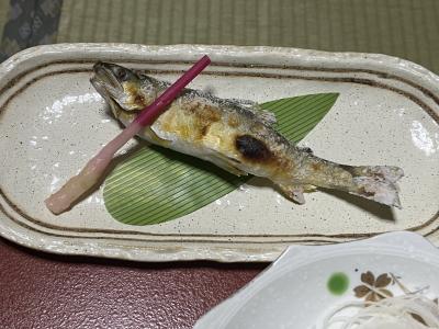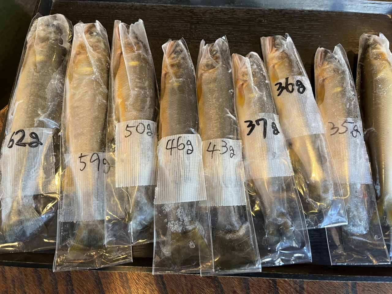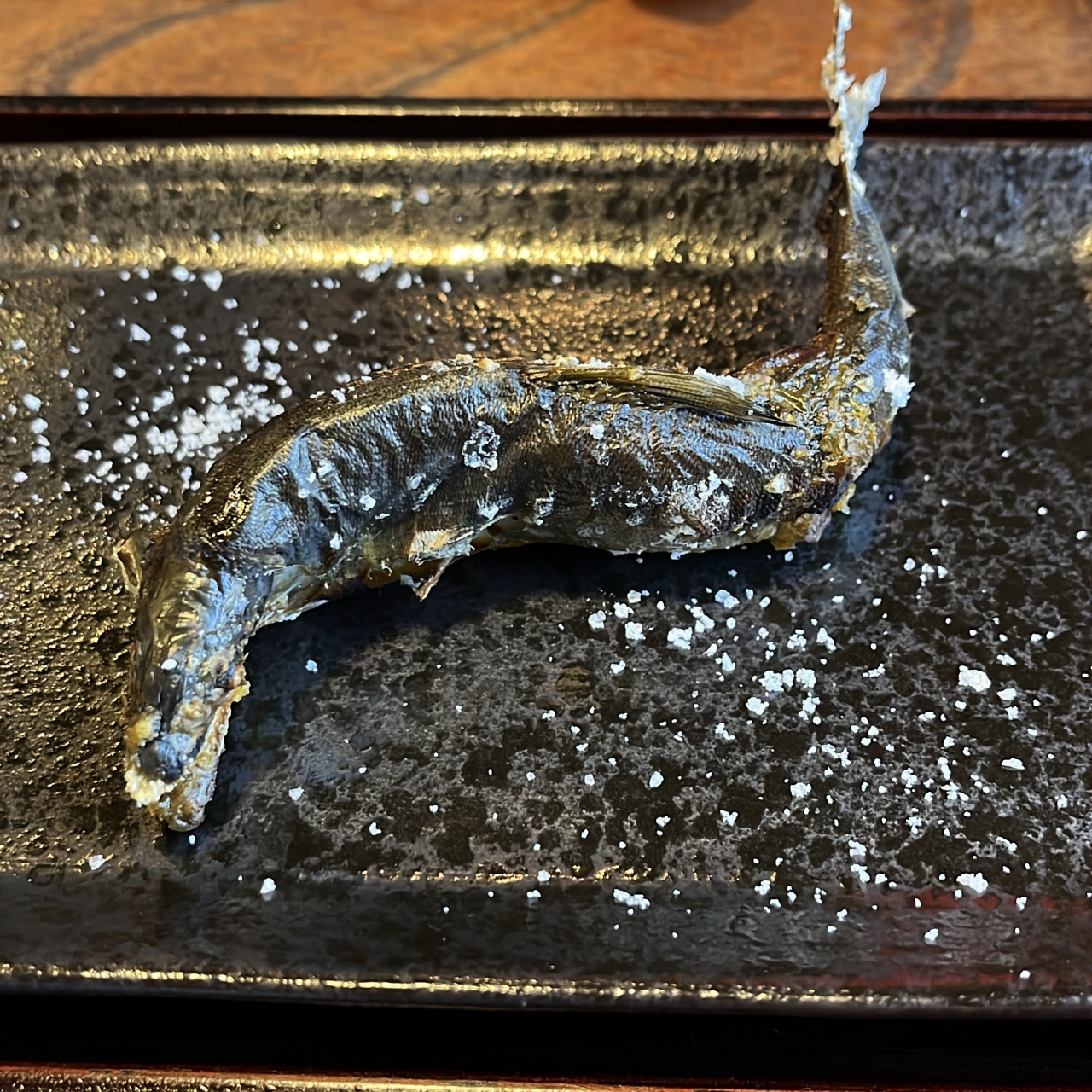 鮎料理の定番 塩焼きは一品料理で注文できます。10尾ほど並べられた鮎から好みの大きさをチョイス、訪問時点では50g未満は1g13円でしたので1匹600円ほど、コスパ最高。生ではありませんが丁寧に処理された鮎は保存状態もよく抜群の美味しさ、20数分の焼き時間で頭から骨まで丸ごと食べられる状態に仕上がっています。大満足です。