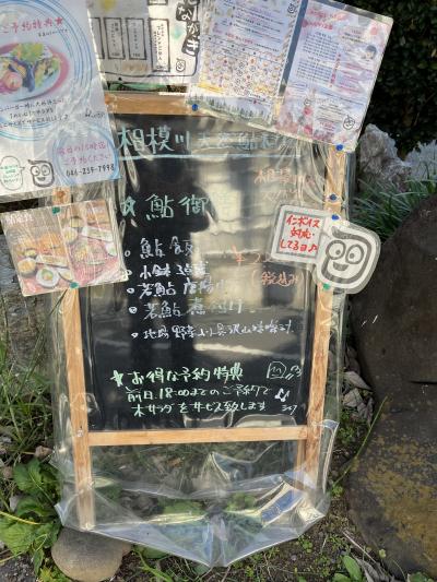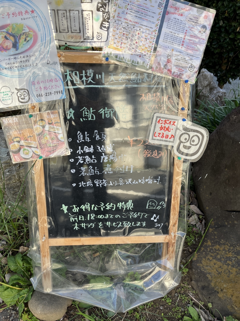 相模川のアユ漁は2023年は6月1日〜10月14日と12月1日〜31日に解禁。その川で店主自ら投網で捕獲したアユを提供するため、2021年オープンしたレストランです。店主は元はパティシエ、西洋料理の経験はありますが日本料理は独学だそう。海老名市の農村部にある居酒屋を居抜きで借り受けたお店は、お世辞にもオシャレとは言い難いですが、手作り感満載でのどかです。