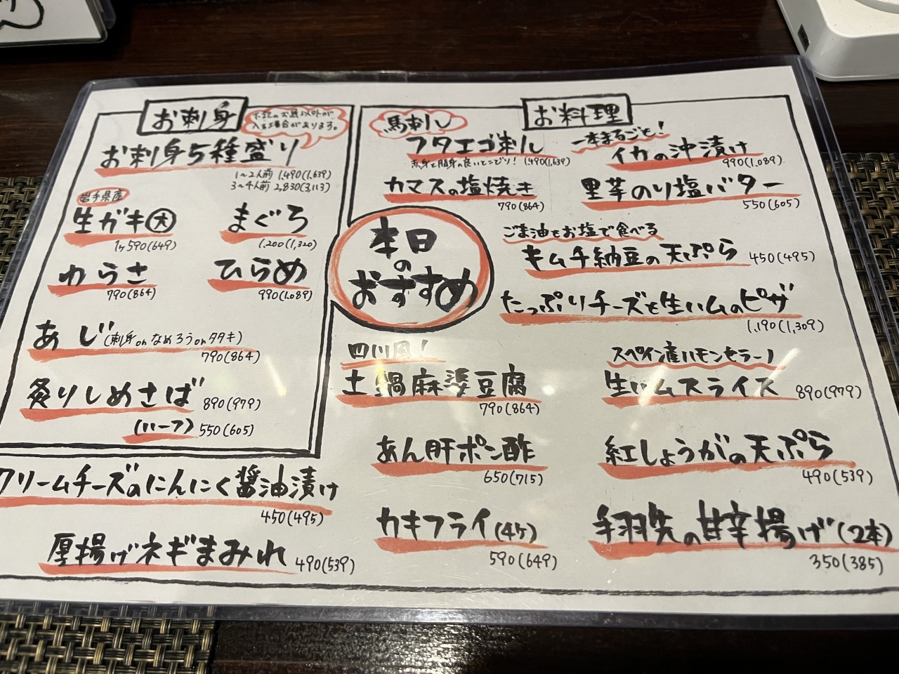 ちょっと分かりにくですが、別途紙のメニューにおすすめ料理があったので、そこから