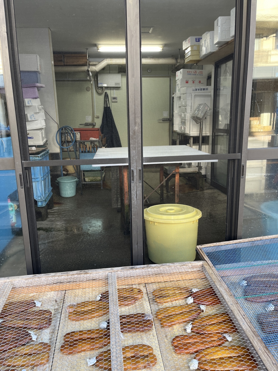 山㐂水産というホテル・旅館向け魚卸が営む海鮮料理店。少しですが惣菜小売りもしています。店の前のカラスミ天日干しが目印。1階が魚屋、2階が料理店。カウンター4席に座敷6卓24席、テーブル2卓10席ほど、小綺麗な店で雰囲気良好。