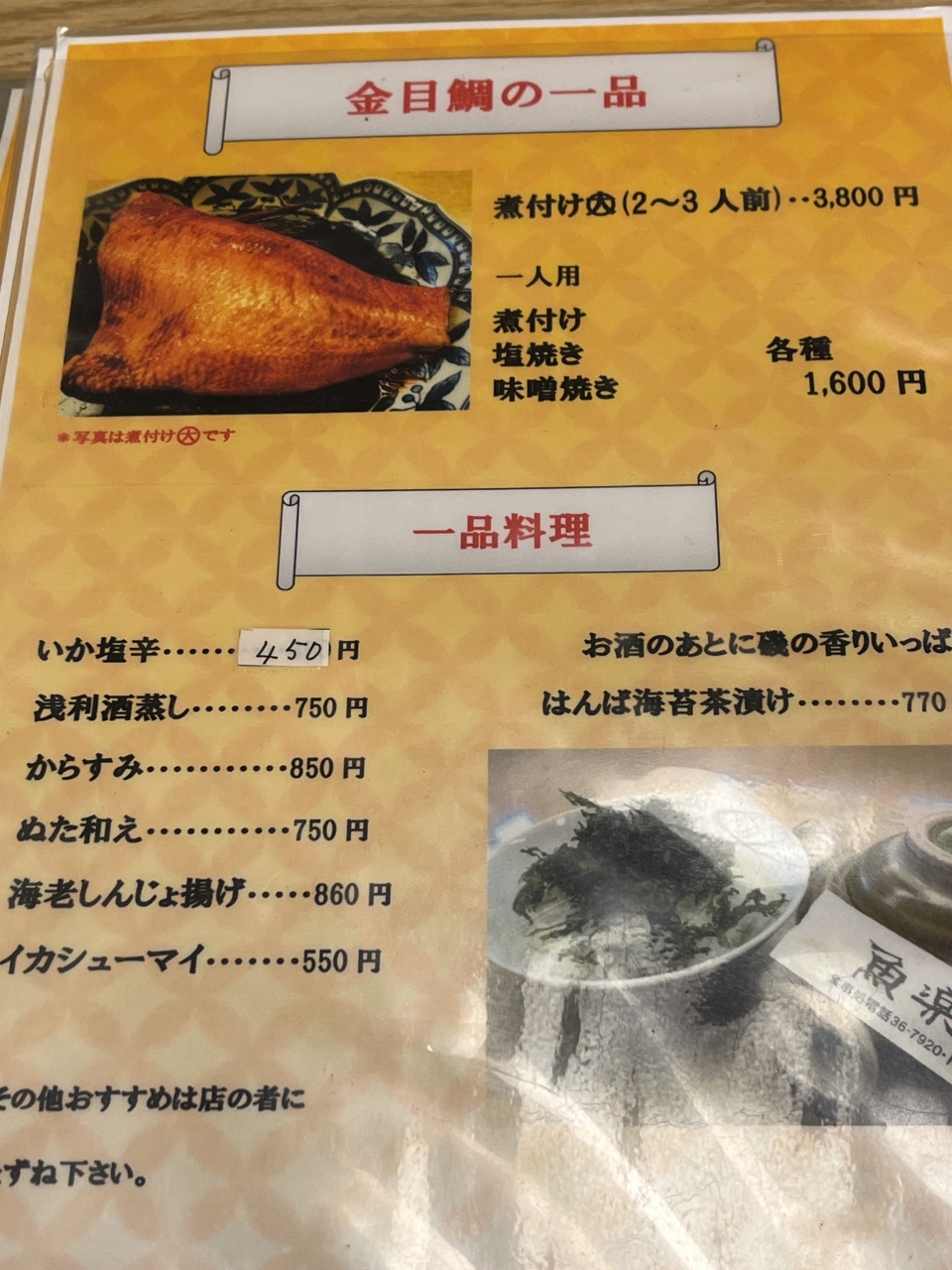 金目鯛煮付けは特大で、煮汁の味付けもさすが地場の料理店です。