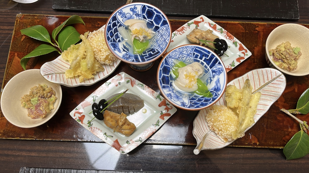 木サラダは、地産地消にこだわった新鮮な地元野菜のプレゼンテーションが美しく、自家製の鮎の魚醤ドレッシングと相まってとても美味しい。オードブルは品数豊富で一品一品丁寧に調理され、こだわりの味で満足です。若鮎の唐揚げは最近増量されたようで1人前20尾はあろうかというほど山盛り。若鮎の凝縮した旨みをふんだんに味わえます。