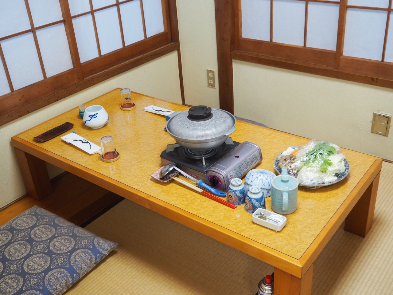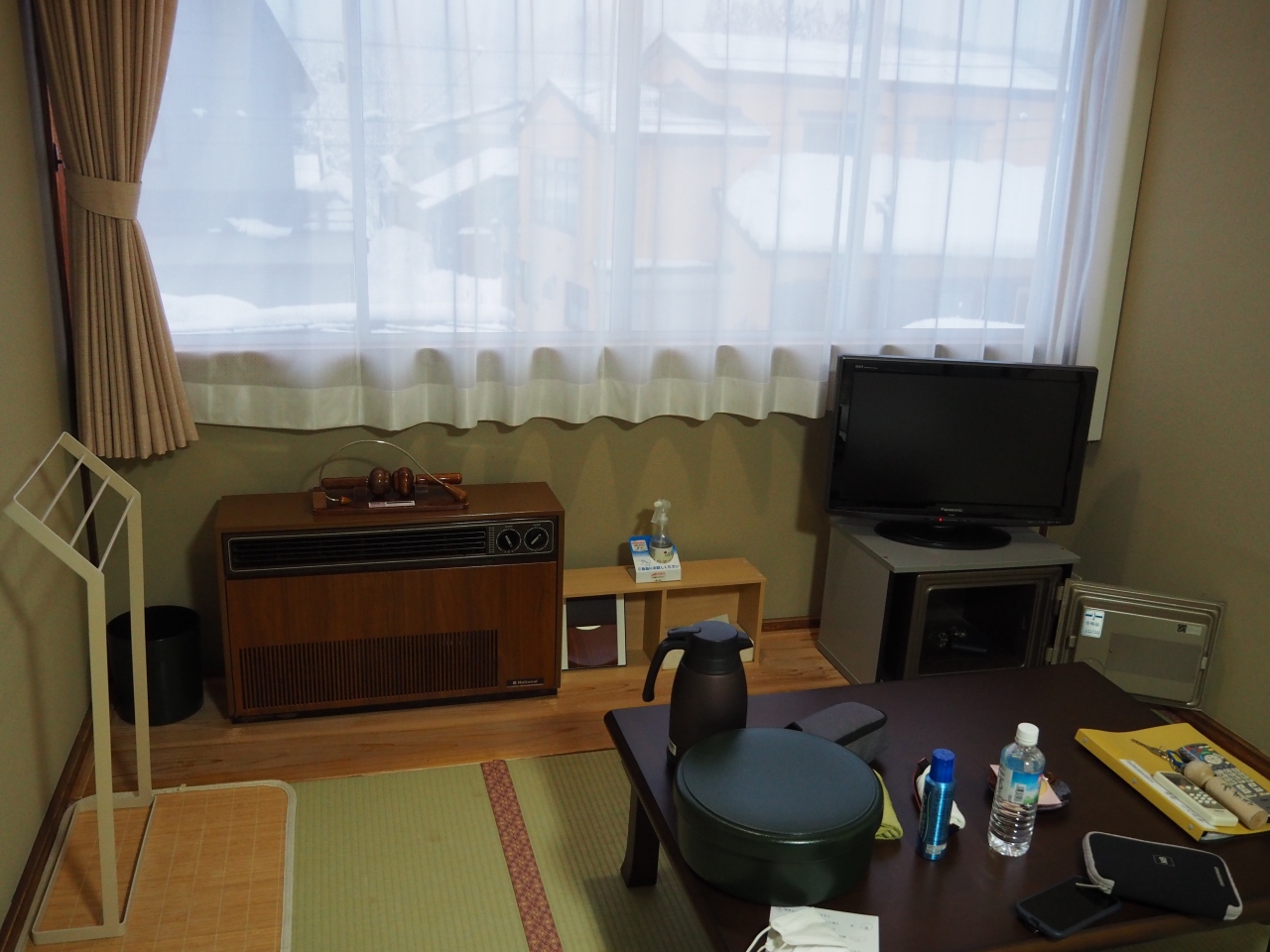 全9部屋の小さな宿。3月初旬の閑散期、他に2〜3組が同宿だったようです。通された部屋は6畳和室。温泉水を通した暖房機と小さなテレビ、和卓ひとつのシンプルな部屋。洗面・トイレは共用。歳なので夜中に何度もトイレに行く私に、多少抵抗があるのは否めません。2階トイレは男女兼用ですが清潔。女子トイレは1階にもあります。実際には、トイレ・洗面で他の客と鉢合わせすることはありませんでした。