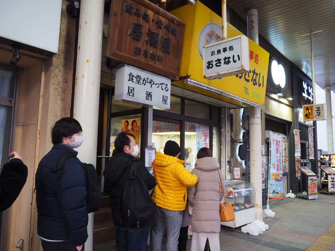 青森への鉄道一人旅、ネットやテレビで評判なので夕食に立ち寄りました。青森駅から288m、徒歩4分、ホテルに向かう商店街にあります。夕刻5時でも案の定、行列ができていましたが10分ほどで入店。インバウンドを含む観光客、地元客で賑わっています。2階に系列の居酒屋がありますが、この時点でもすでに満席、そちらに向かった客はすごすご撤退を余儀なくされていました。