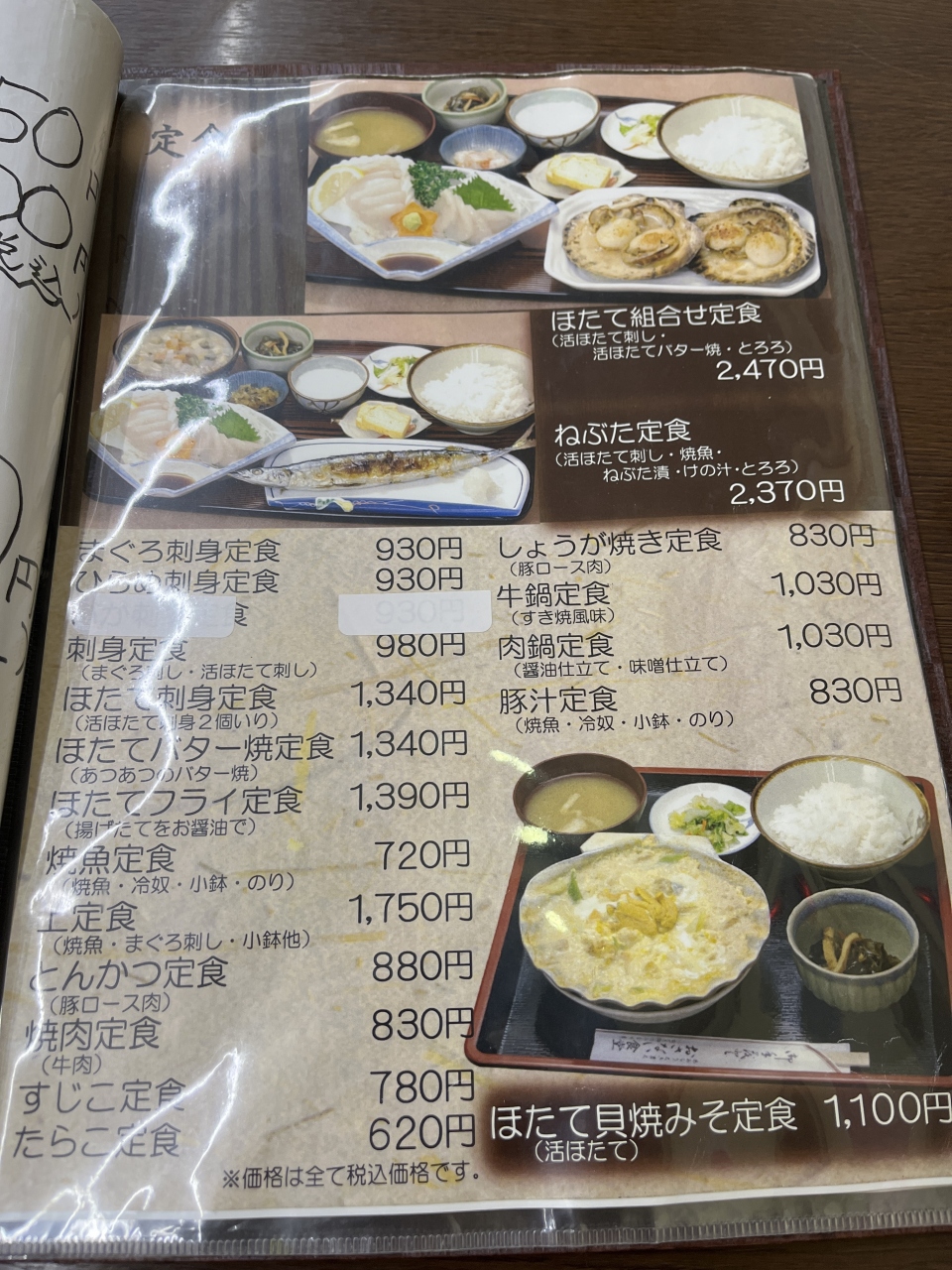 メニューが多彩で選ぶのに戸惑いましたが、青森名物ほたて刺身定食 1,340円を選択、田酒純米酒1合 800円を追加しました。ほたて刺身は悪くはありませんが、味はまあ普通。青森に来たという実感が湧きません。郷土料理や一品料理を追加するなど、もう少しオーダーを工夫すればよかったと反省です。定食付け合わせの煮物の小鉢、塩辛、豆腐、卵焼きは美味しかった。さすが評判の人気店だけのことはあります。