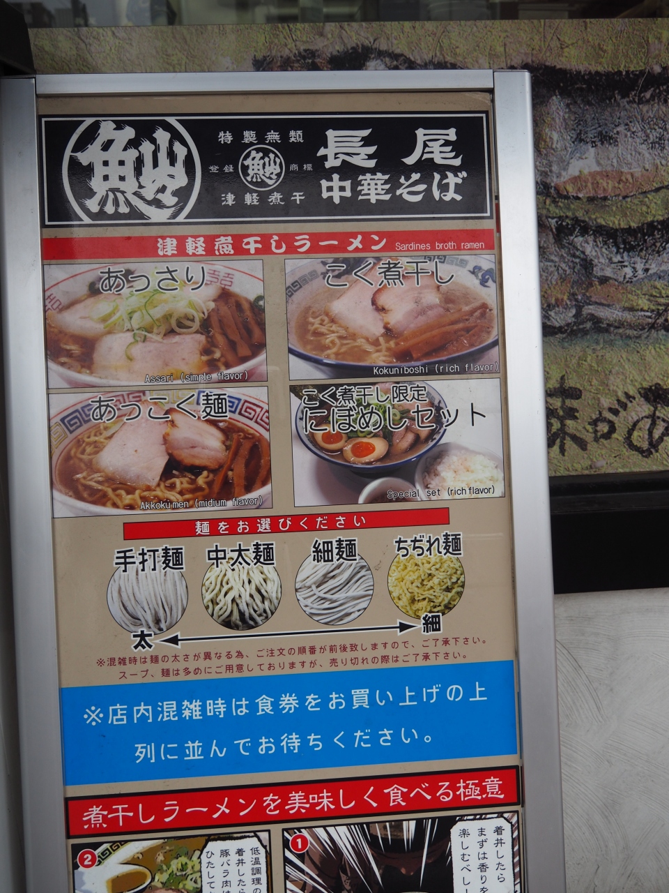 メニューはあっさり、こく煮干し、あっこく麺から選べます。麺も手打麺、中太麺、細麺、ちぢれ麺の4種類から選びます。首都圏で提供される濃いめの煮干しスープに閉口していた私はあっさりを選択、あとは「普通」と言っておいたのでたぶん手打麺ではなかったでしょうか。