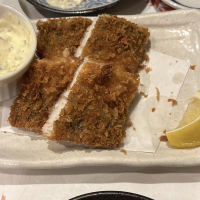 その後、中々水割 605円に切り替えて、鰺フライ 1,320円を追加したところで、友人とのランチ&おしゃべり帰りの妻が合流。