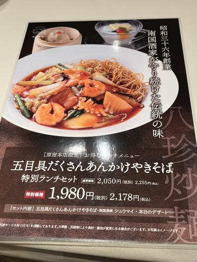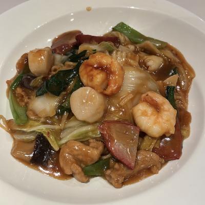 「あんかけ焼きそば」は、柔らか焼きそばに濃いめ味付けの餡。チャーシュー、ホタテ、エビ、イカ、豚肉、白菜、椎茸、筍、ニラなど謳い文句通り具沢山、贅沢です。美味しくてお腹いっぱい。
