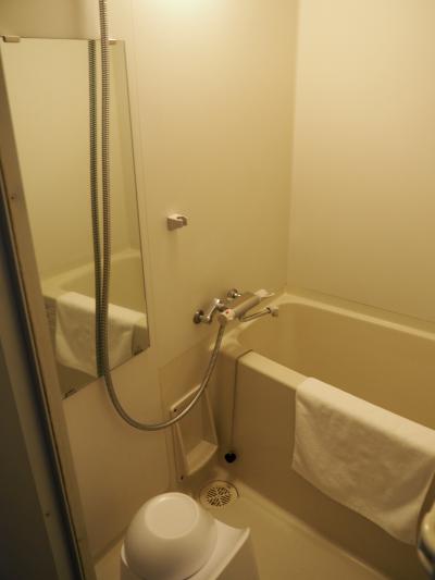 客室に入るとまずその狭さに驚きます。14平米だから一般的なビジホサイズですが狭く感じるのはバス・トイレが別室、しかも浴室を洗い場付きにしたためです。スペースに余裕があれば嬉しい配慮ですが、そこまで期待していません。風呂にこだわるなら大浴場を設けた方が良いのでは。ただし、設備は全て清潔に掃除されていてこの点では問題ありません。