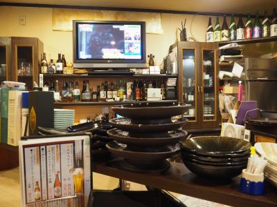 中年夫婦が2人で営む居酒屋。地元客が2組、全体で6~7名がカウンターと座敷で飲んでいます。ようやく夕食にありつけるとほっと一息入れます。