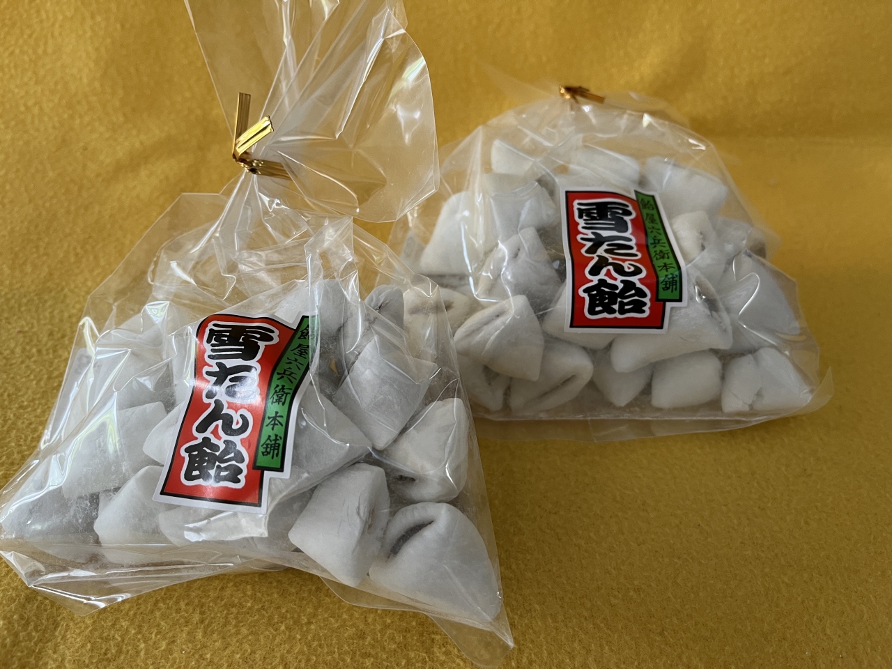 気に入ったので雪たん飴2袋を購入しました。おまけに別の飴玉をたくさんいただきました。そのどれもが美味しい。