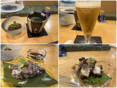 とりあえず生ビール(付き出しにマグロの甘辛煮)、おつまみにシャコと水蛸の桜煮を注文。