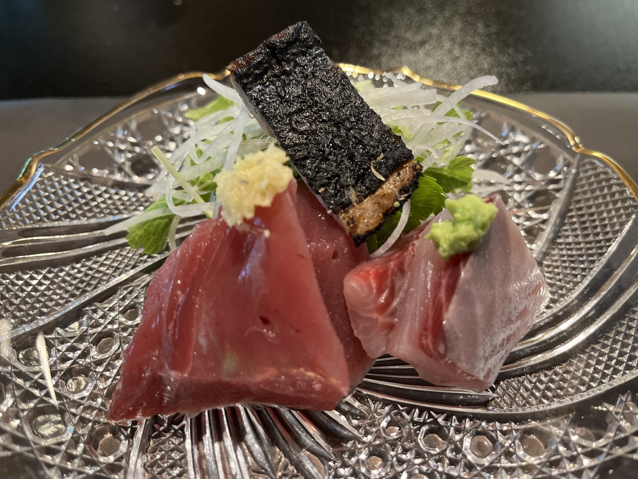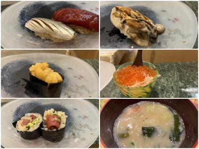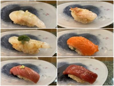 お寿司は「おまかせ握り」12貫。ネタはホウセキハタ、キンキ、ボタンエビ、ベニジャケ、中トロ、赤身のヅケ、コハダ、ホタテ、カキ(センポウシ)、ムラサキウニ、イクラ、マグロの巻物です。