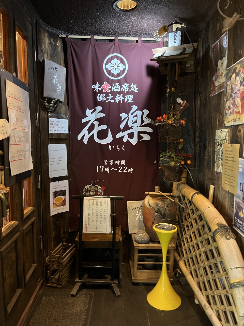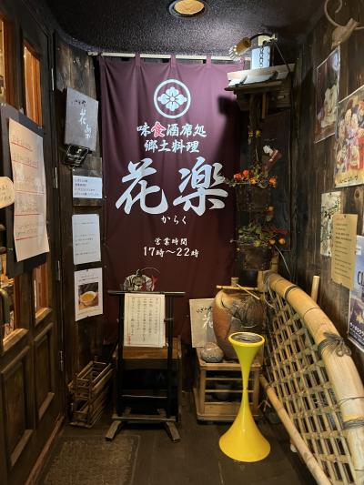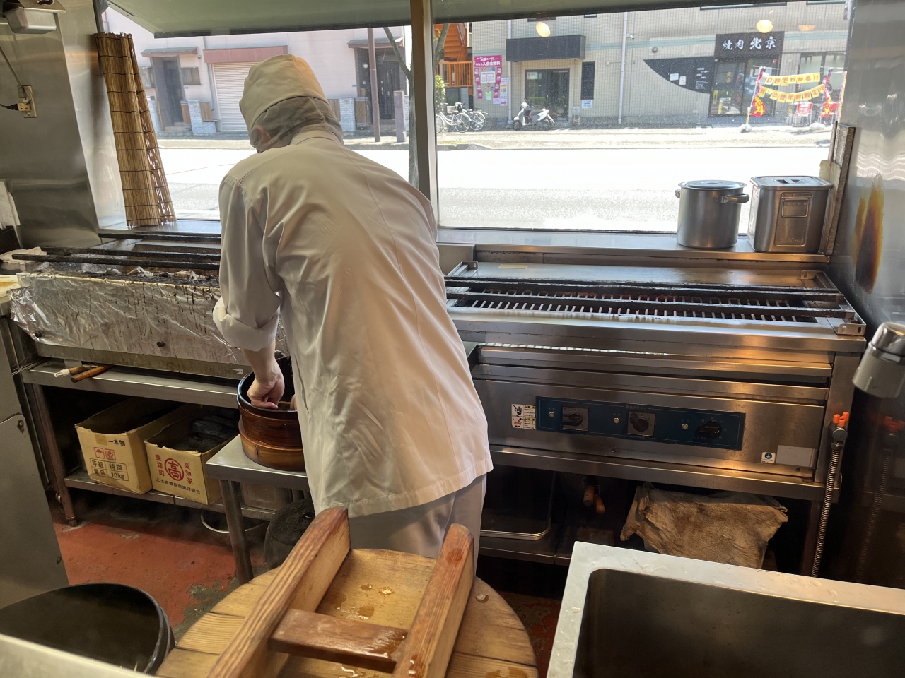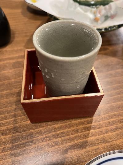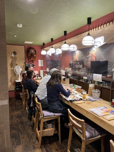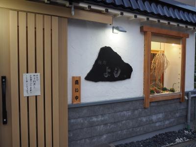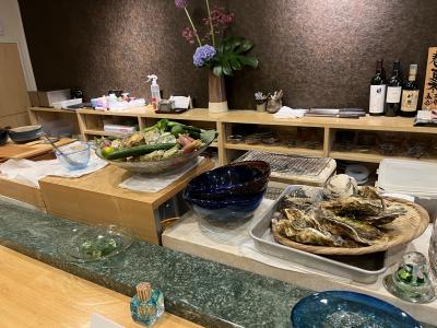 市内観光を終えて予約の6時ちょっと前、お店に到着。扉に「予約客のみの営業」の掲示があります。カウンター7席、2階にお座敷もあるようですがまだ誰も来ていないようです。カウンターに案内されます。私たちの後に地元常連客らしい3人組が来店しました。