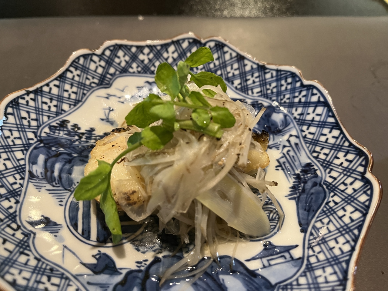 焼物(すずき、破竹と新牛蒡、地場のクレソン載せ)
