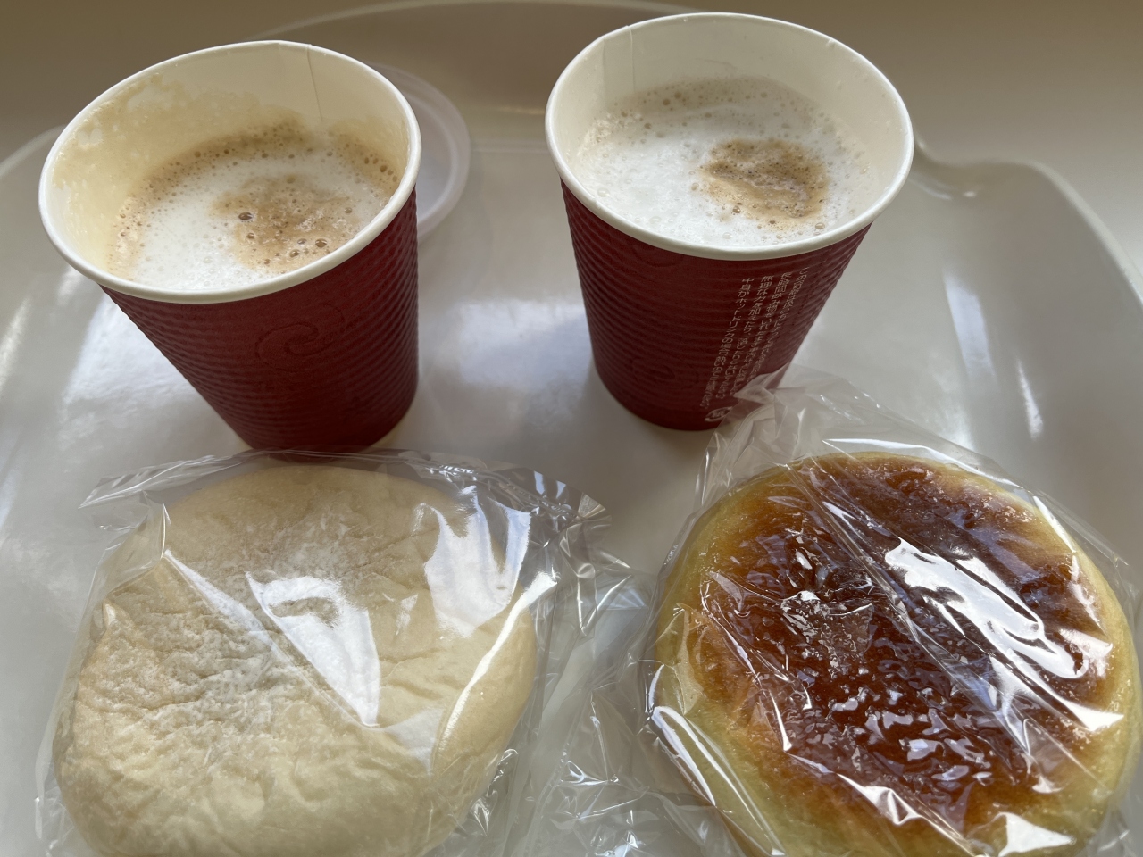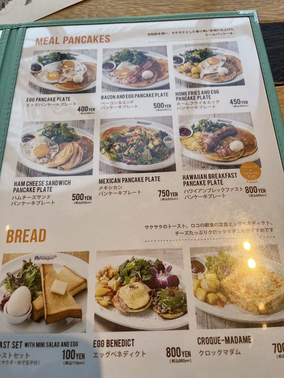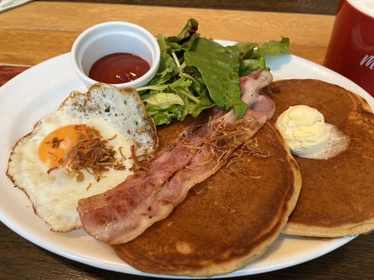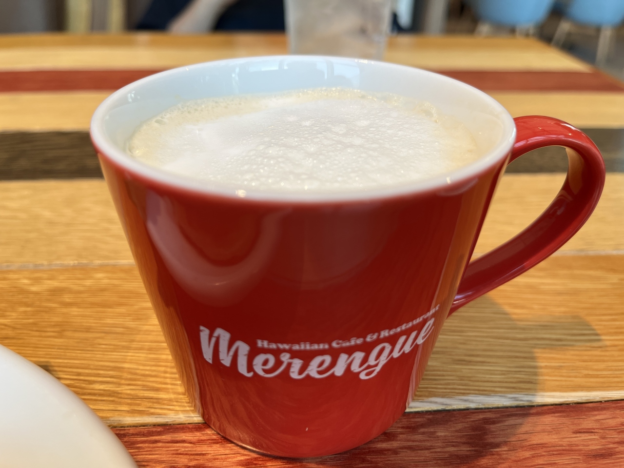 私はベーコン&エッグ パンケーキプレート500円とコナブレンドカフェオレ580円、妻はモーニングフルーツパンケーキ(2枚)450円とコナブレンドカフェオレ580円をオーダー。どちらも美しいプレゼンテーションで気分が高まります。前者はメレンゲ使いではなく、全粒粉のモチモチパンケーキです。味は普通に美味しい。ハワイでこれを食べたら1人3,000円はすると思うので、そう考えるとお得です。