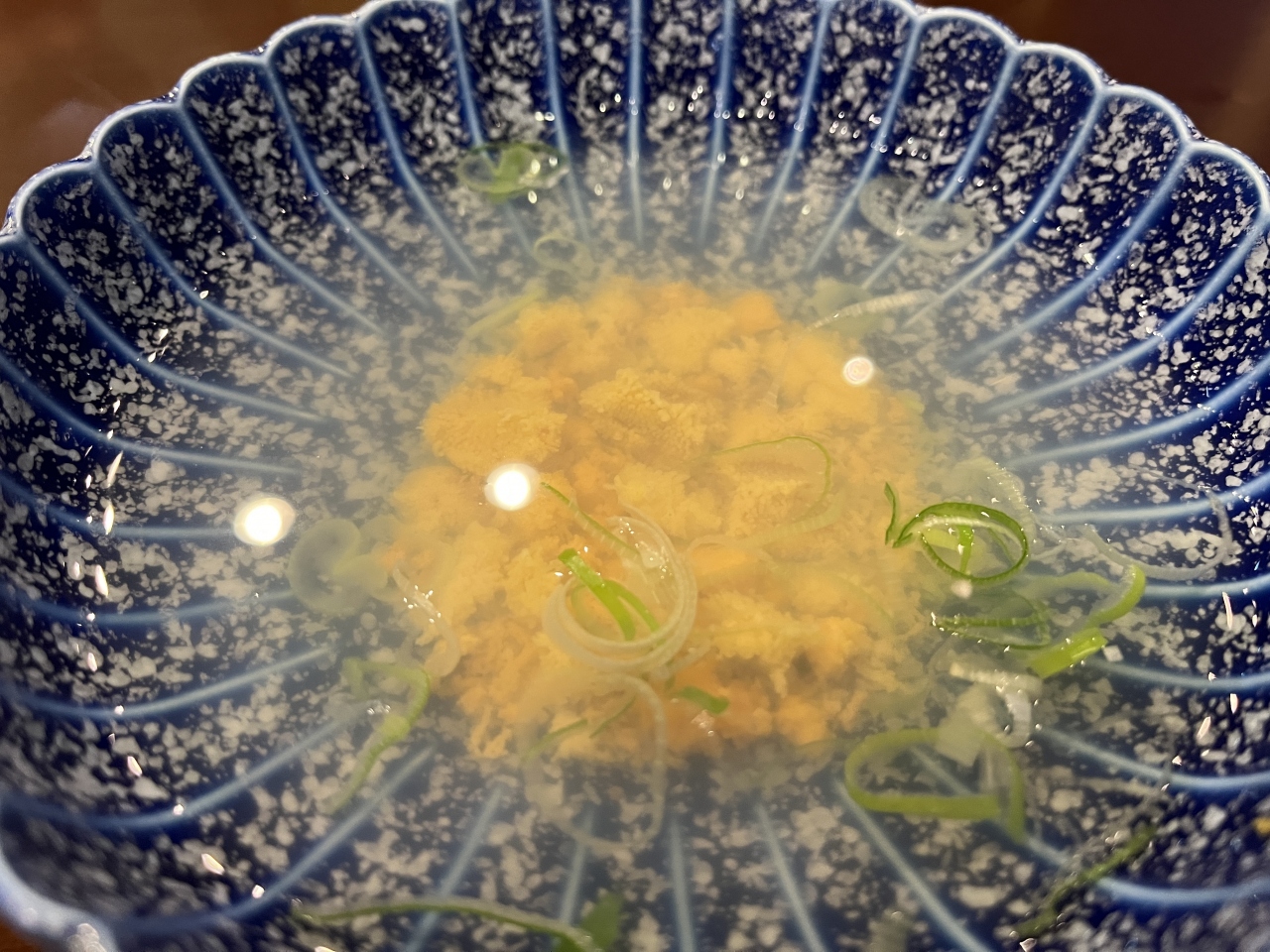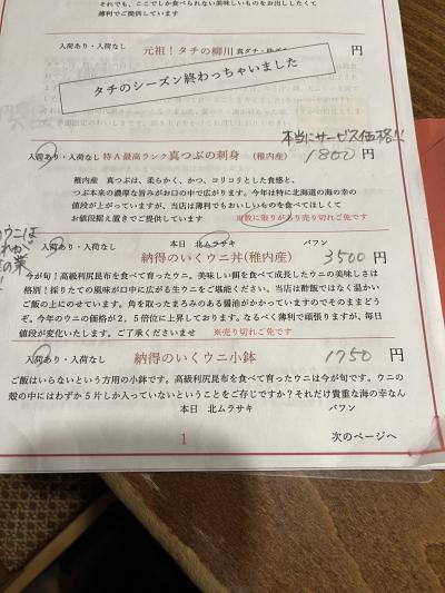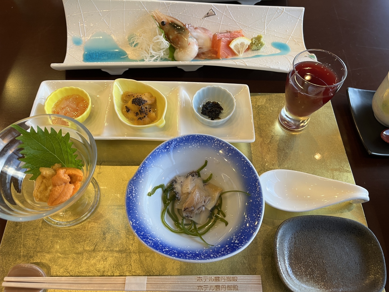 夕食は雲丹尽くし。殻付き雲丹、生雲丹、炙り雲丹、雲丹の茶碗蒸し、三平汁、雲丹丼などこれでもかというほど雲丹のオンパレード。その他の料理も申し分ありません。レストランなどで食べればこれだけで1万円以上してもおかしくありません。