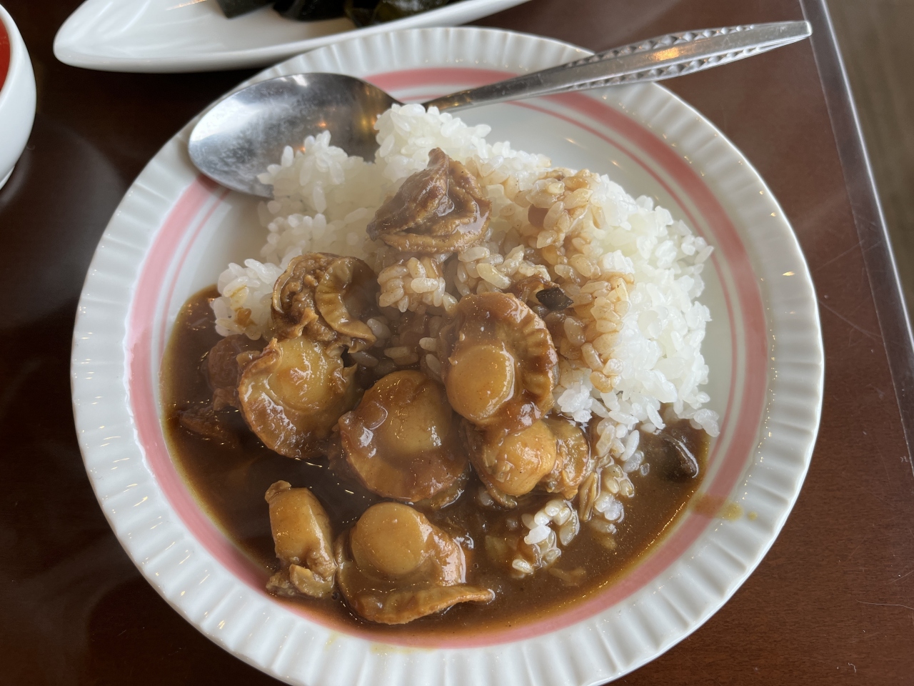 朝食は定番珍味やワカメしゃぶしゃぶに加え、カフェテリア方式で様々な料理が選べます。料理民宿の名に恥じない充実ぶりです。オススメは帆立カレー、腹一杯になります。