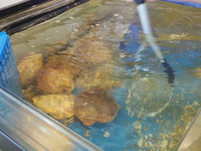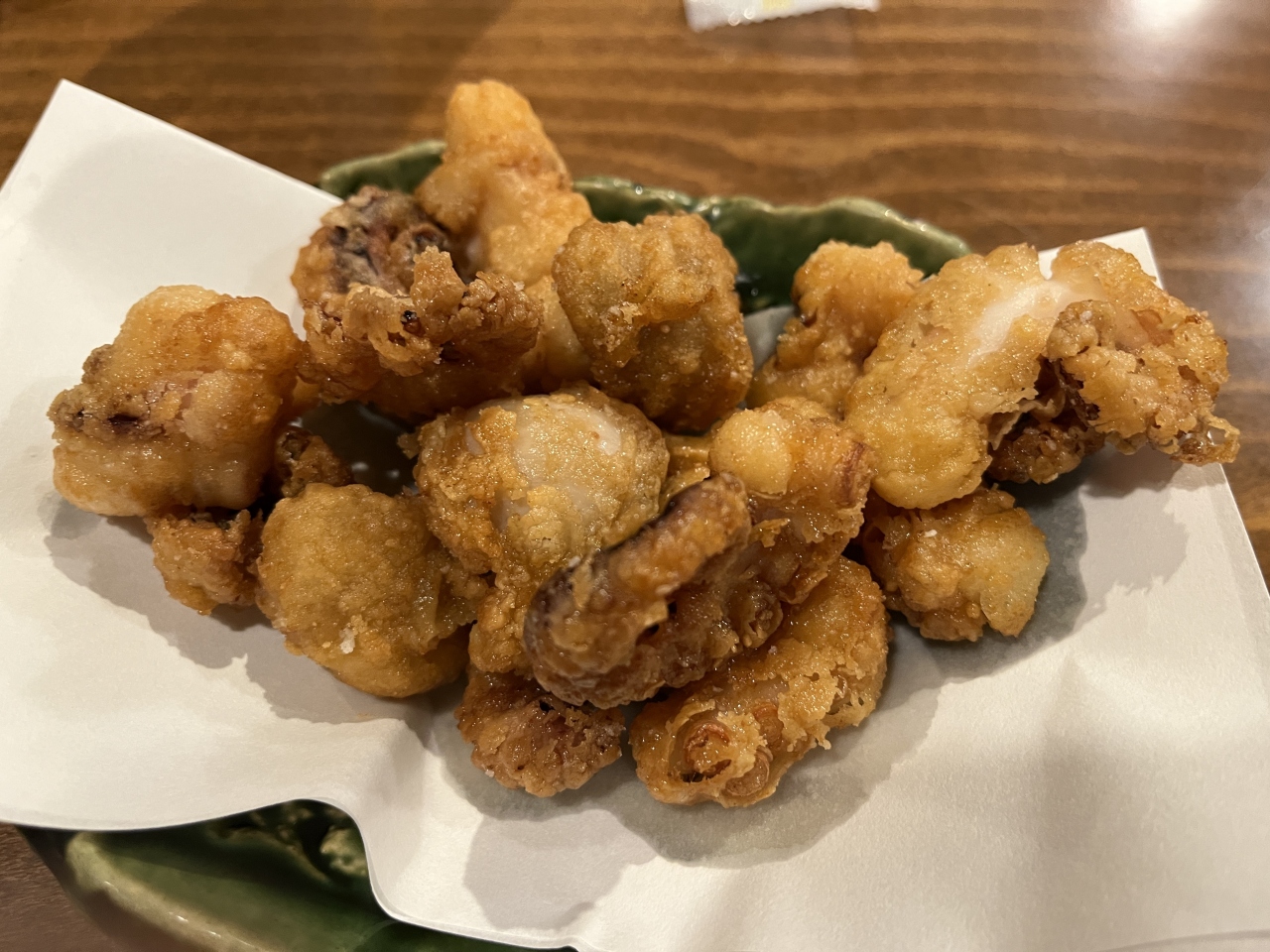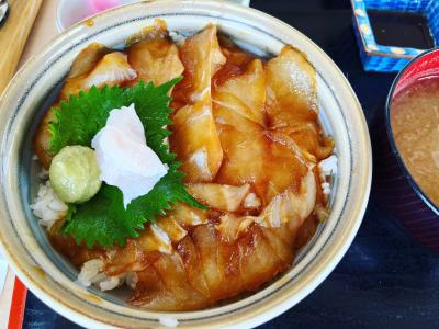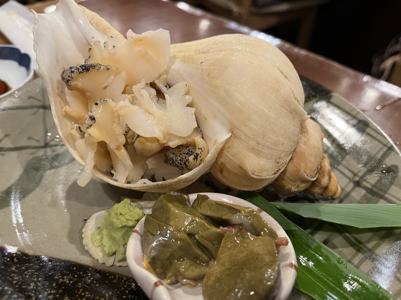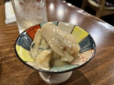 メニューは豊富、珍しい料理もあり選ぶのに迷います。結局、私は刺身定食2,100円、妻は八角焼き定食1,700円を選び、二人でシェアしました。八角は関東の居酒屋などでたまに見かけますが、居酒屋に縁のない妻は未体験です。接客担当のおばさんたちは明るくテキパキと対応してくれて好感度大です。待っている間にホッケのすりみ揚げをサービスで出してくれました。熱々で美味しい。