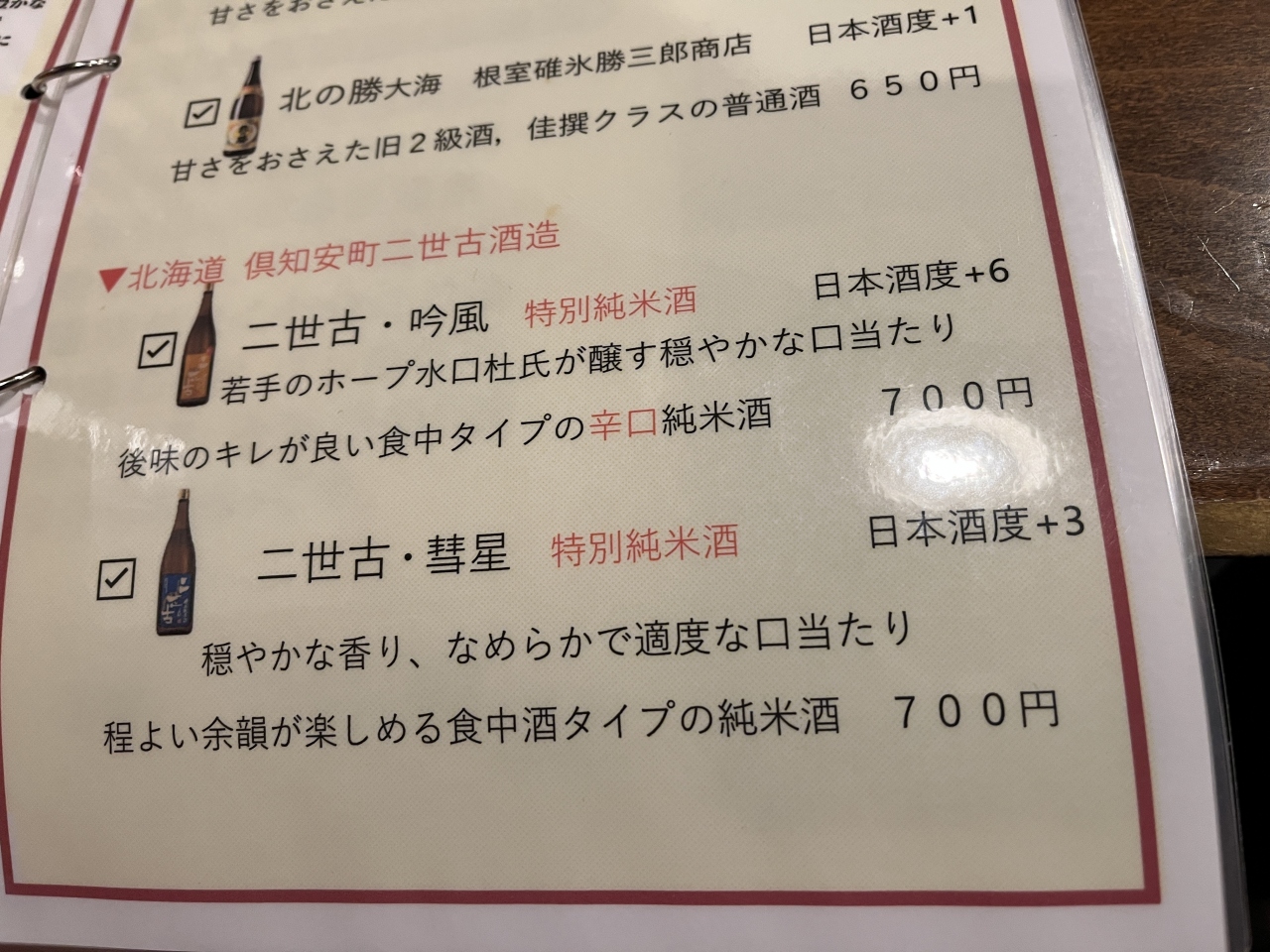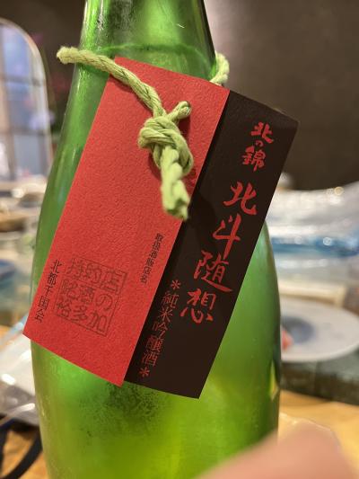 お酒は、地元の二世古純米原酒と北斗随想。後者は洞爺湖サミットで乾杯酒として使われたそう。どちらも初めてですが、なかなかに美味しいお酒です。
