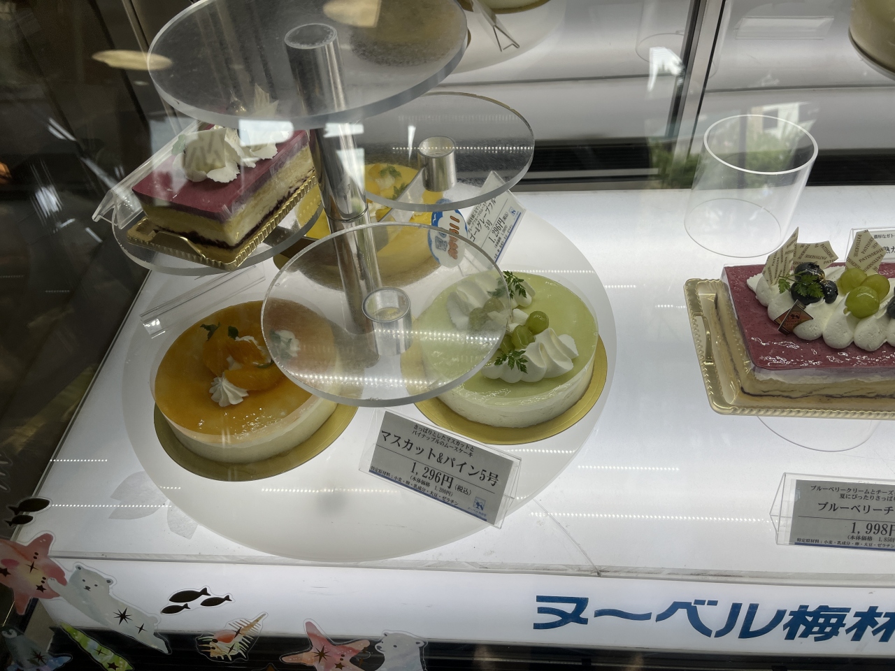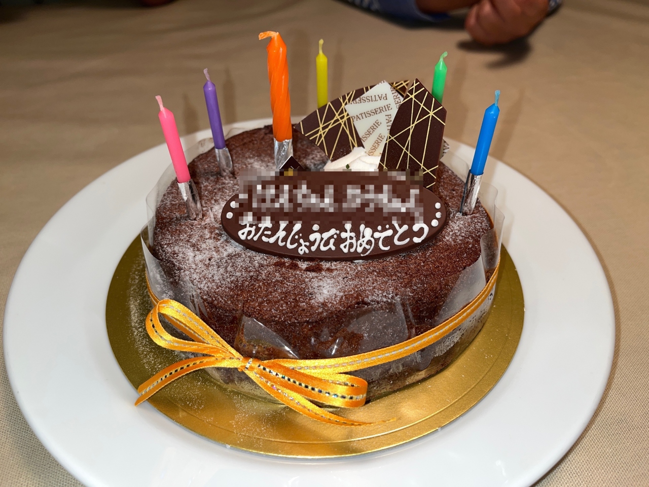 ウィンドウにはロールケーキ、チーズケーキ、ブランマンジェ、モンブラン、ショートケーキなど多種類のケーキが並び、その横には予約済みのバースデーケーキがたくさん並んでいます。私たちは予約していなかったので、店頭のホールケーキからガトーショコラを選びました。親切な店員さんとパティシエが対応してくれて、板チョコのネームプレートとロウソクも付けてくれます。